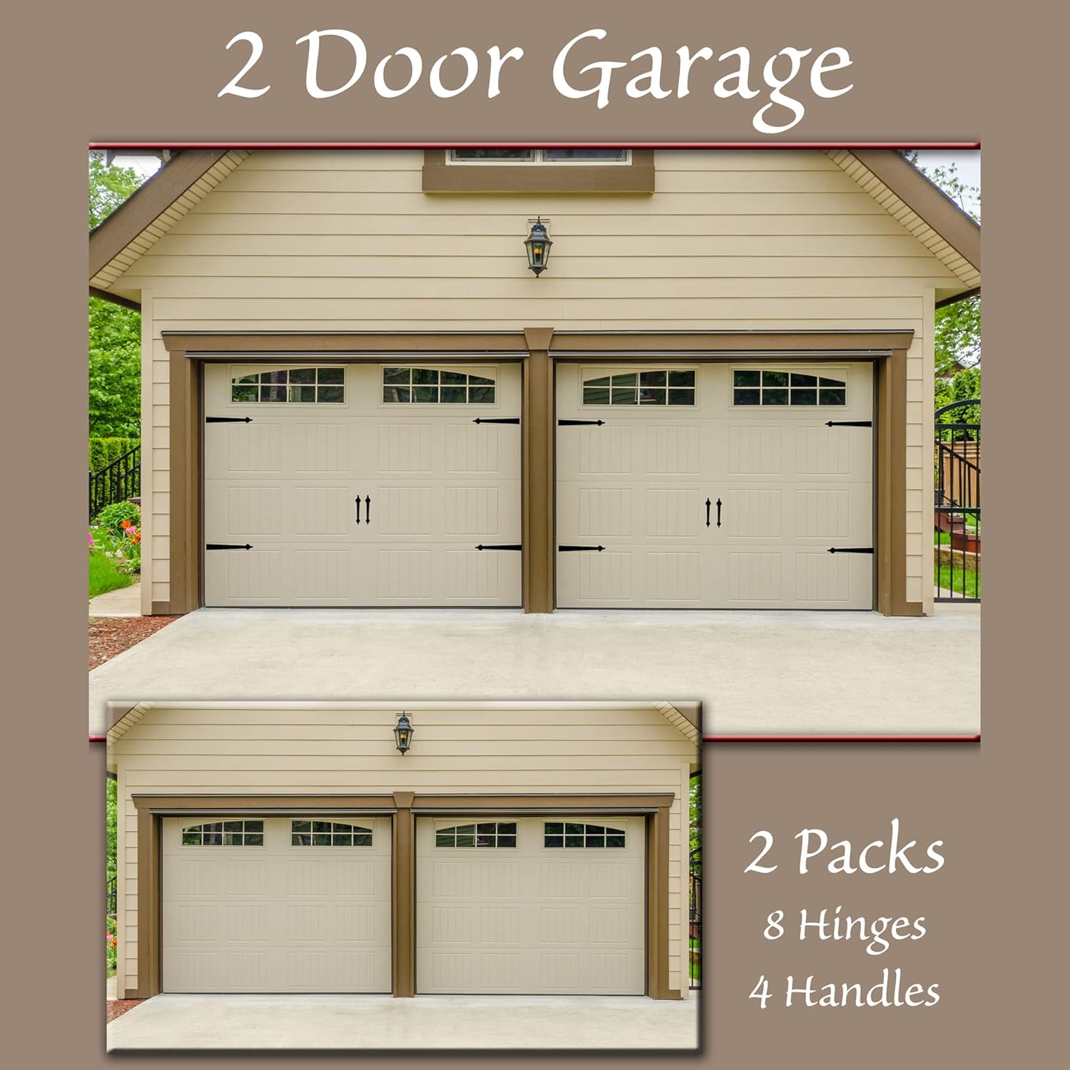 - Decorative magnetic carriage door accent handles (2) and hinges (4) that attach quickly and easily to steel garage doors