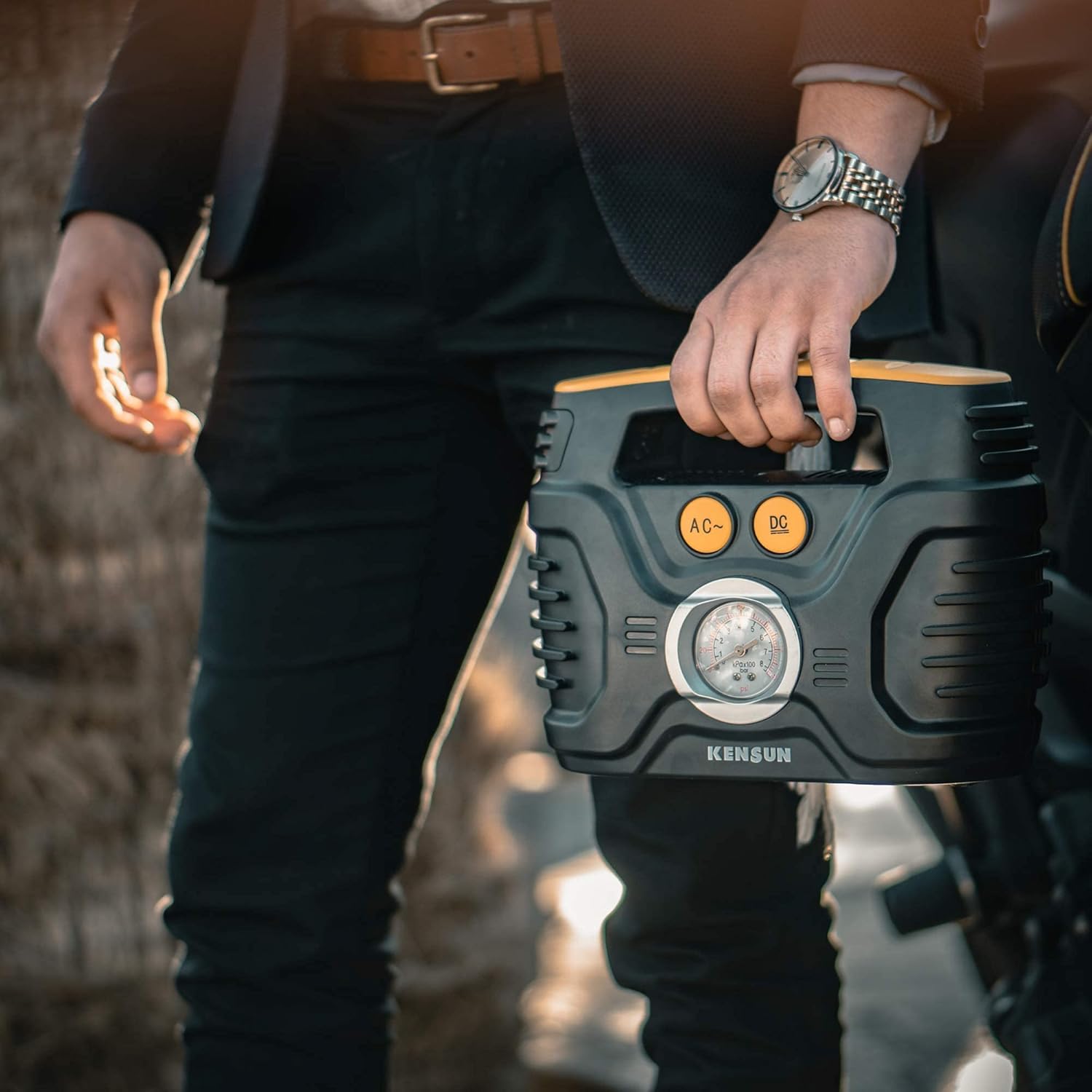 Kensun Portable Air Compressor Pump for Car 12V DC and Home 110V AC Swift Performance Tire Inflator 100 PSI for Car - Bicycle - Motorcycle - Basketball and Others with Analog Pressure Gauge (AC/DC)