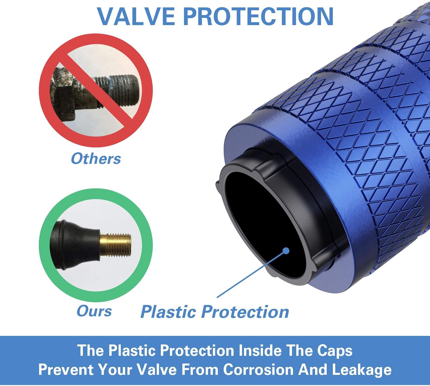 - Special Design – Metal materials are prone to rust in the presence of water and oxygen, which may lead to corrosion on valve body. The plastic inner valve caps design combines the attribution of corrosion resistance of plastic and the stylish look of metal.