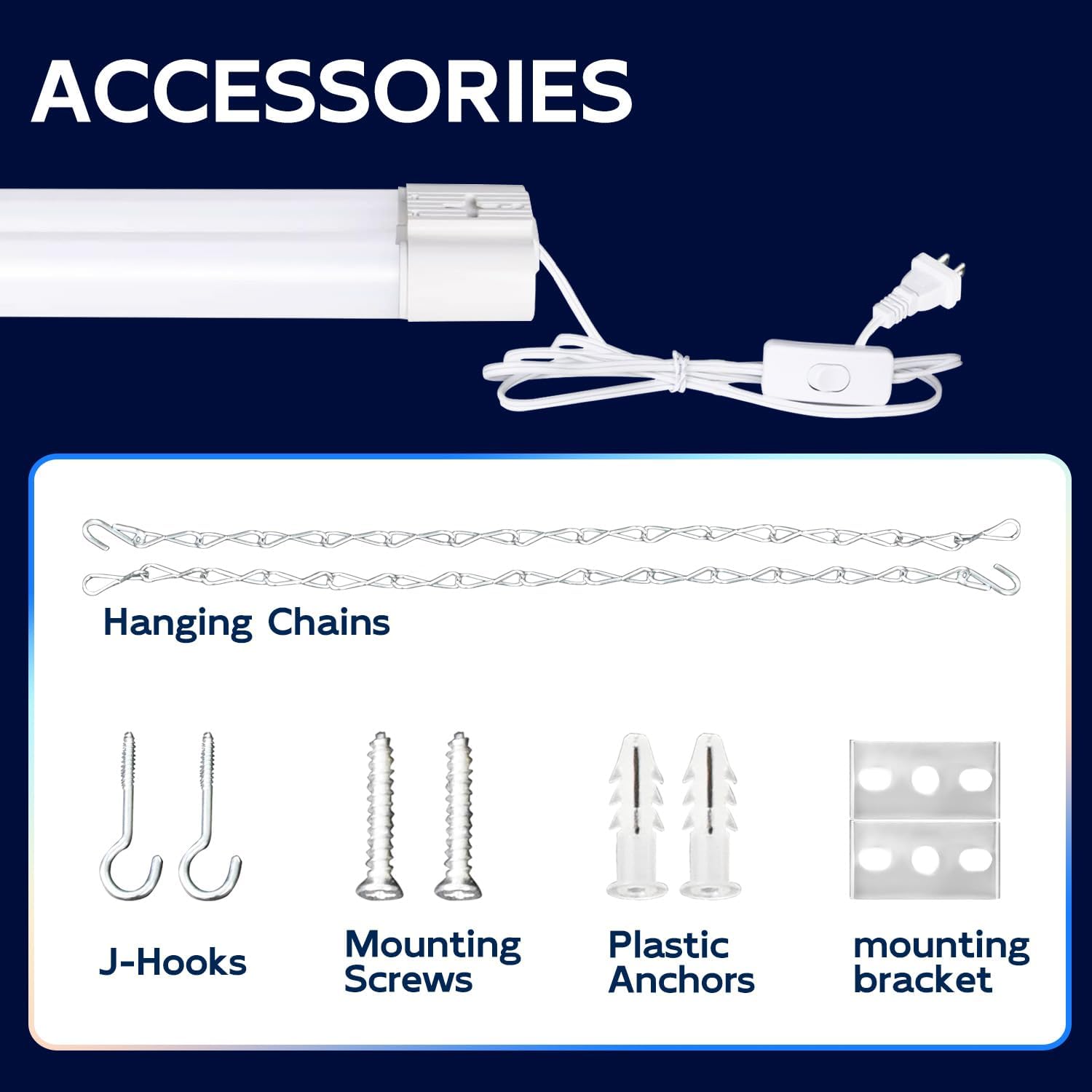 - ✅ Easy Installation - Plug & Play. Come with 59" power cord with on/off switch and other small accessories. You can hanging it with the included hanging chains or directly mounted to the ceiling with the included mounting screws
