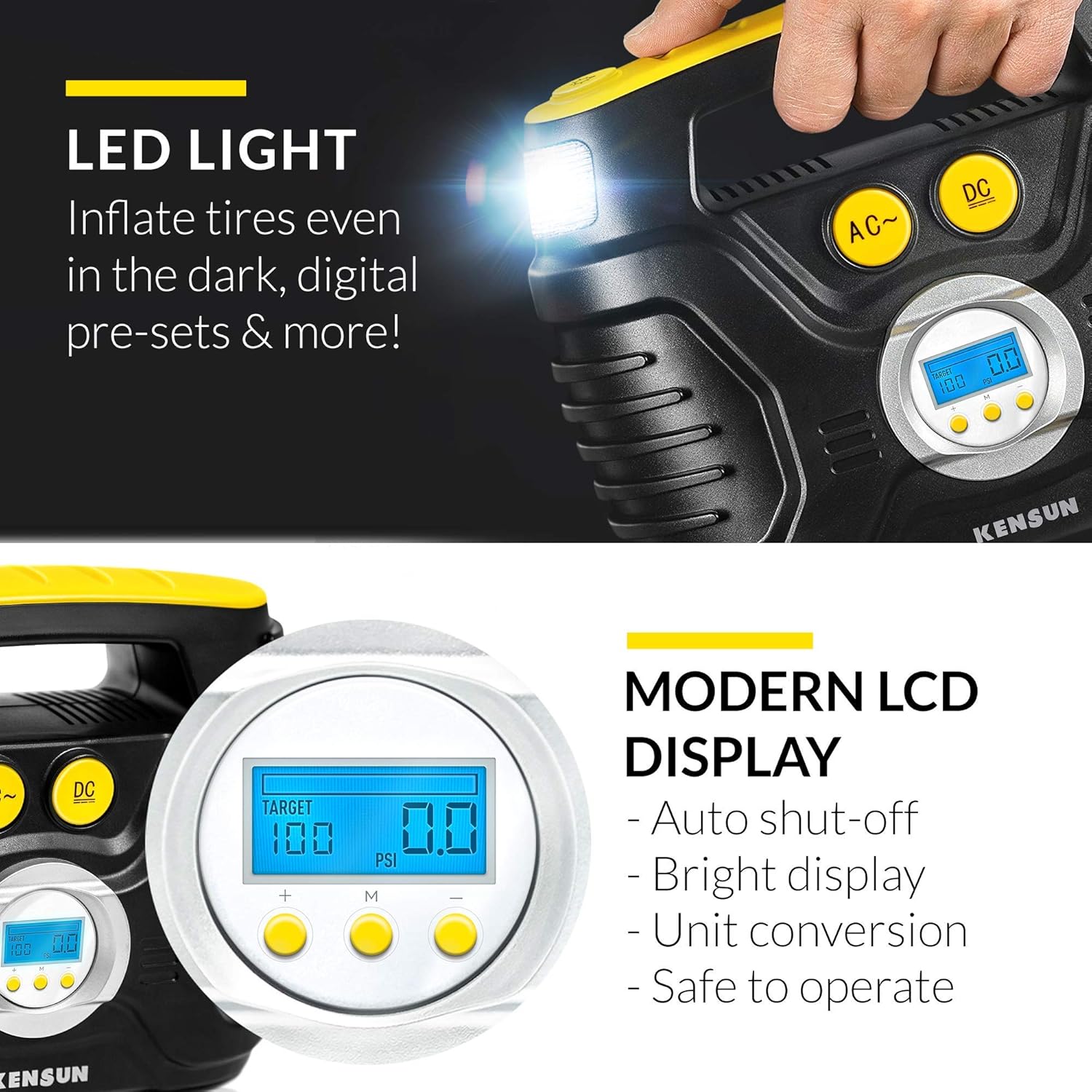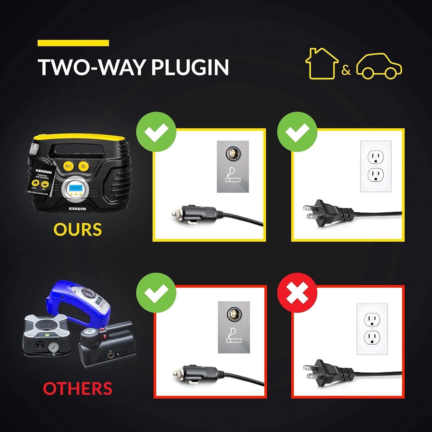 - AC/DC FOR CAR AND HOME: Kensun’s unique AC/DC switching with 12V car cigarette light plug as well as 110V wall plug for home outlet makes this inflator more useful since you can use it anywhere.
