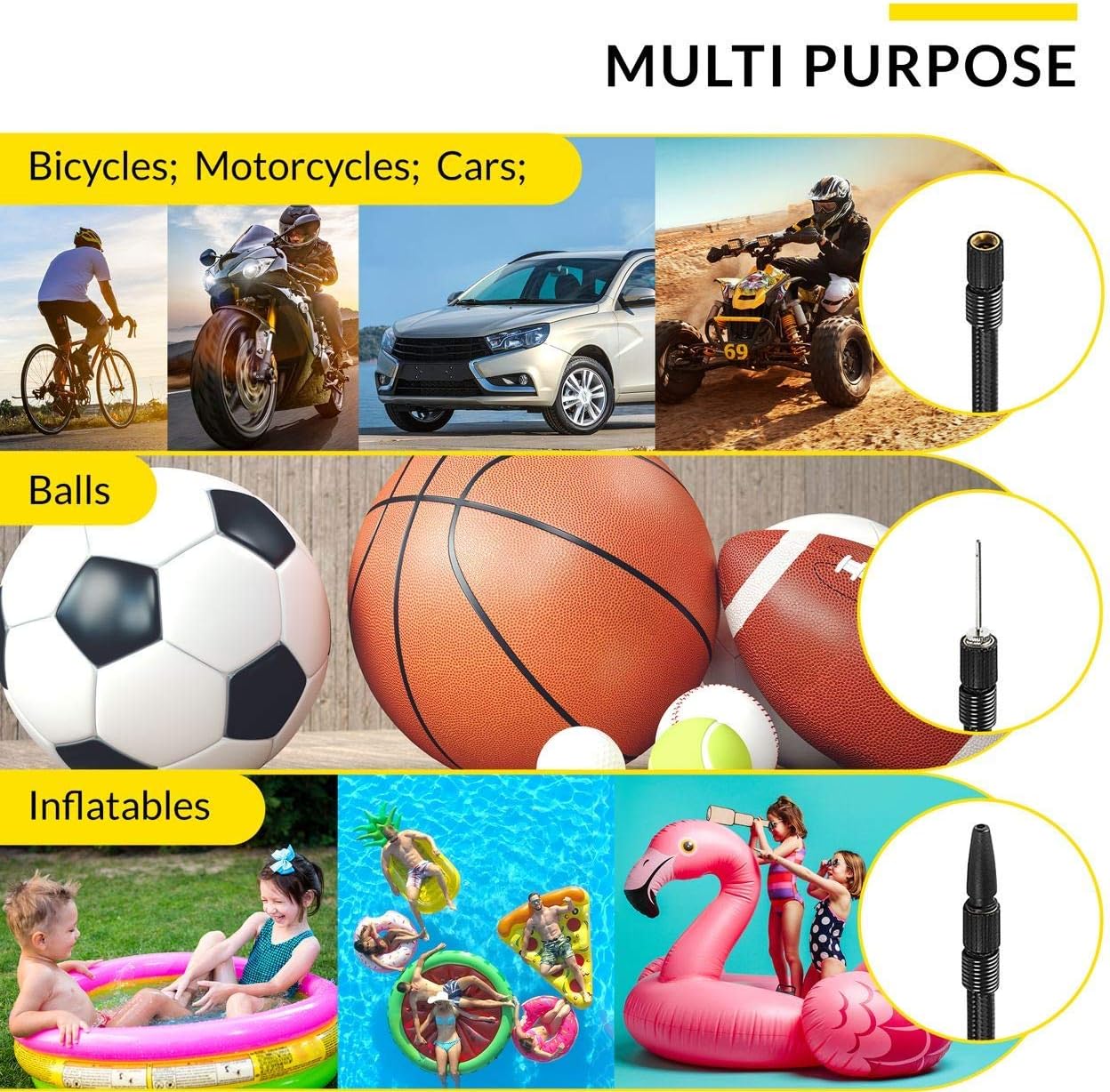 - MULTI-PURPOSE: Inflate tires of cars, bikes, sedan and midsize SUV. Adaptors for balls and inflatables included, in addition to the unique AC/DC capabilities makes this inflator useful in any situation. Presta valve adaptor is not included.