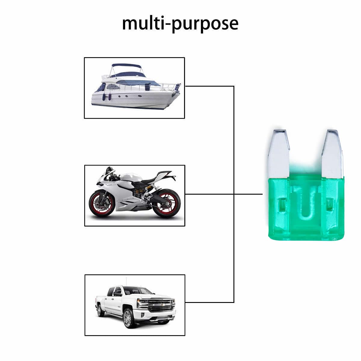 - WIDELY USE - These assorted fuses are specifically designed for Cars, Trucks, SUVs, ATVs, UTVs, Camper RV, Motorcycles, Fleet, Golf Car, Boat, snowmobiles, and most general DC applications etc., covering such components as radio, light, turn signals, etc.