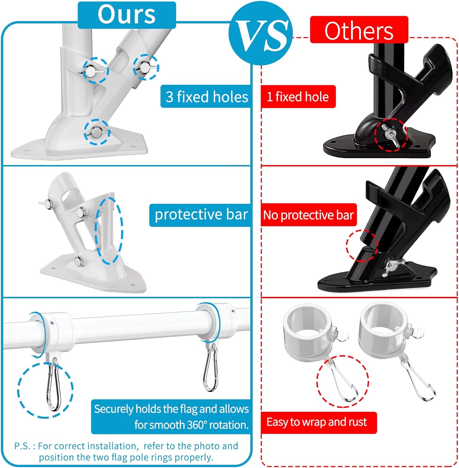 - Unique Bracket: The high strength aluminum alloy flag pole holder for outside house has been upgraded with unique protective bar and 3 fixed holes to make the two-position (90° and 45°) flagpole more stable
