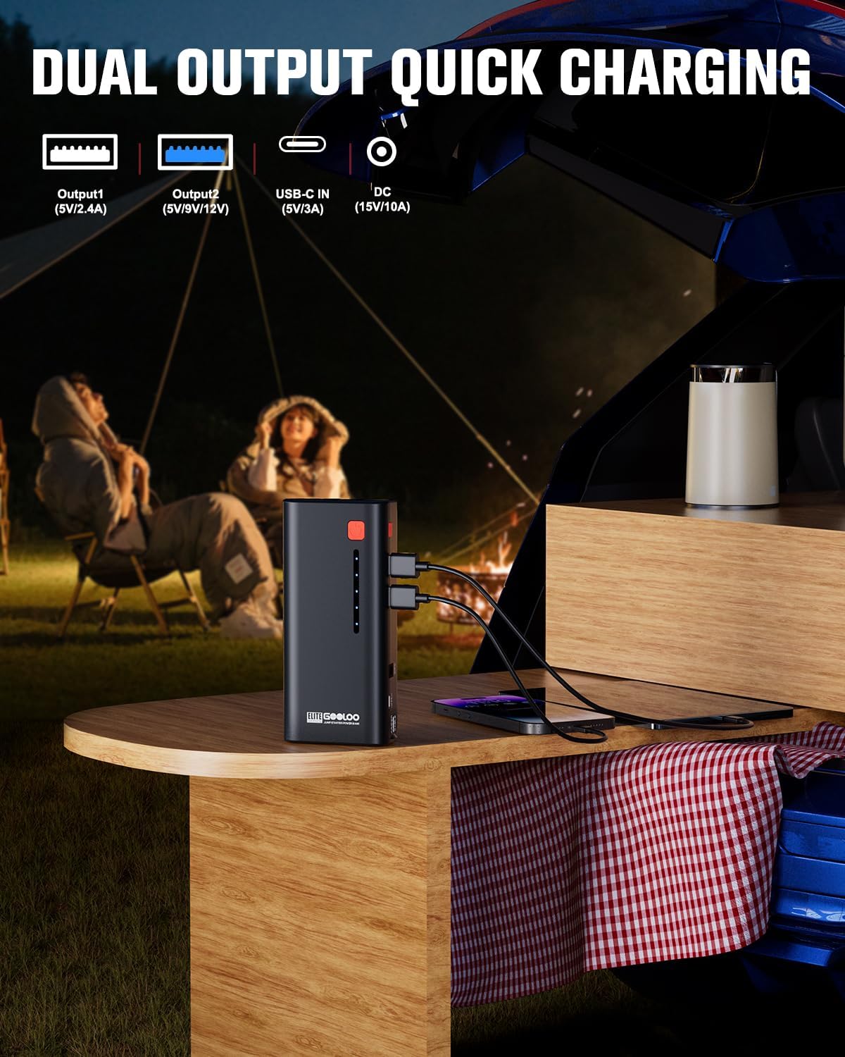 - POWER BANK CHARGER: The GOOLOO portable car battery jump starter box can be used to charge numerous devices using its USB output ports (5V 2.1A, 5V 2.4A/9V 2A) or 15V 10A output using the included cigarette lighter socket. The quick-charge 3.0 USB port charges your devices faster and is compatible with almost all USB charging devices, including cell phones, tablets, Kindles or digital cameras.