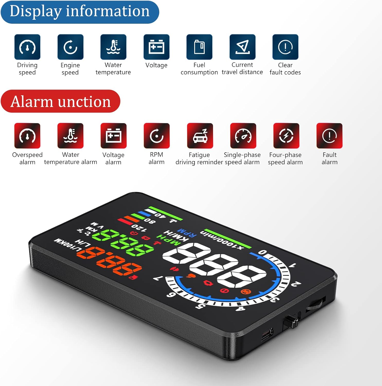 - 【MULTI-FUNCTION】——A8 HUD is upgraded with new functions, making it different from the traditional HUD on the market and more competitive. Since A8 is based on reading data from the trip computer, it can be used to read automobile data information, such as car failure detection, failure alarm and failure clearing. A multifunctional tool to help you understand your car.