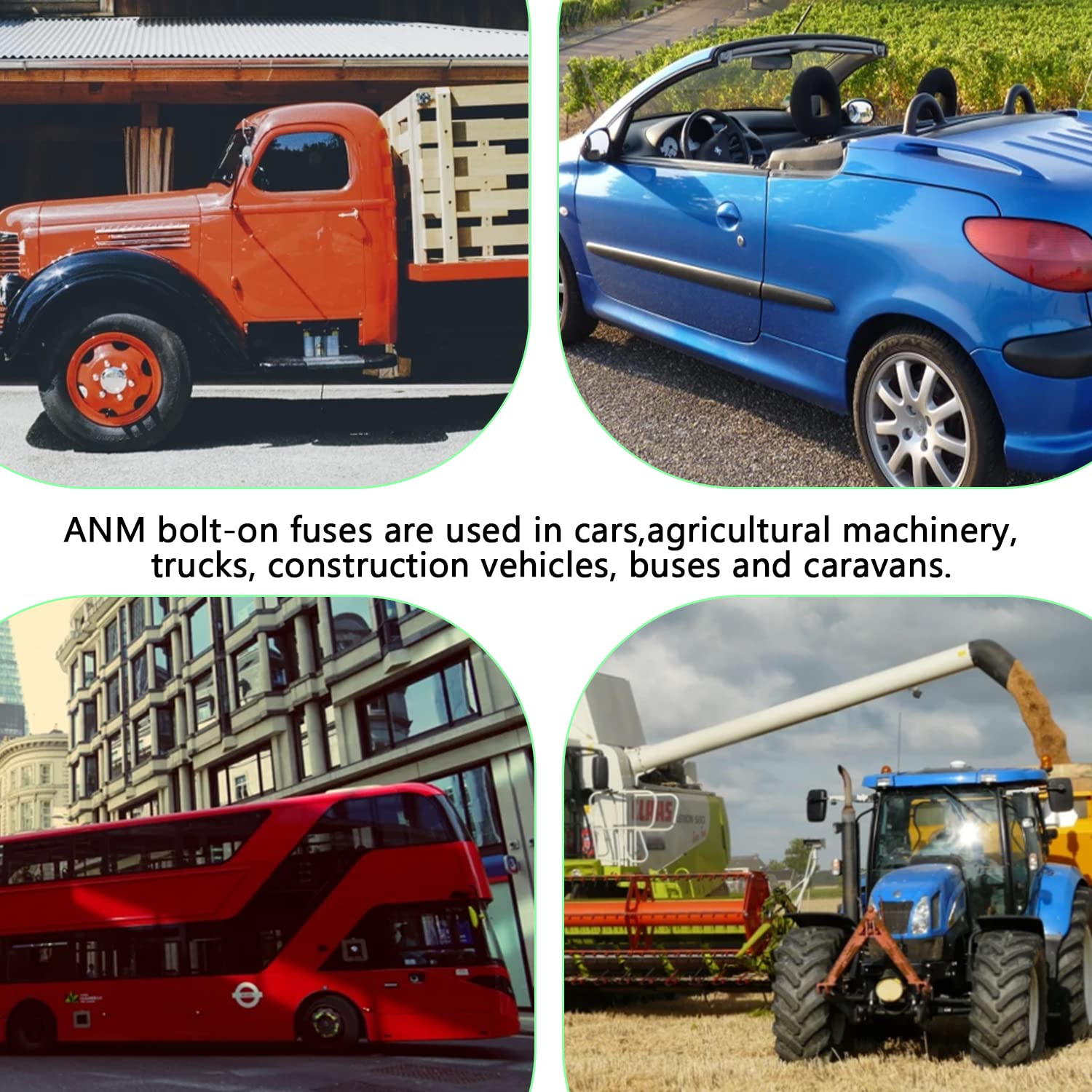 - Application: ANM bolt-on fuses are used in cars, trucks, agricultural machinery, construction vehicles, buses and caravans