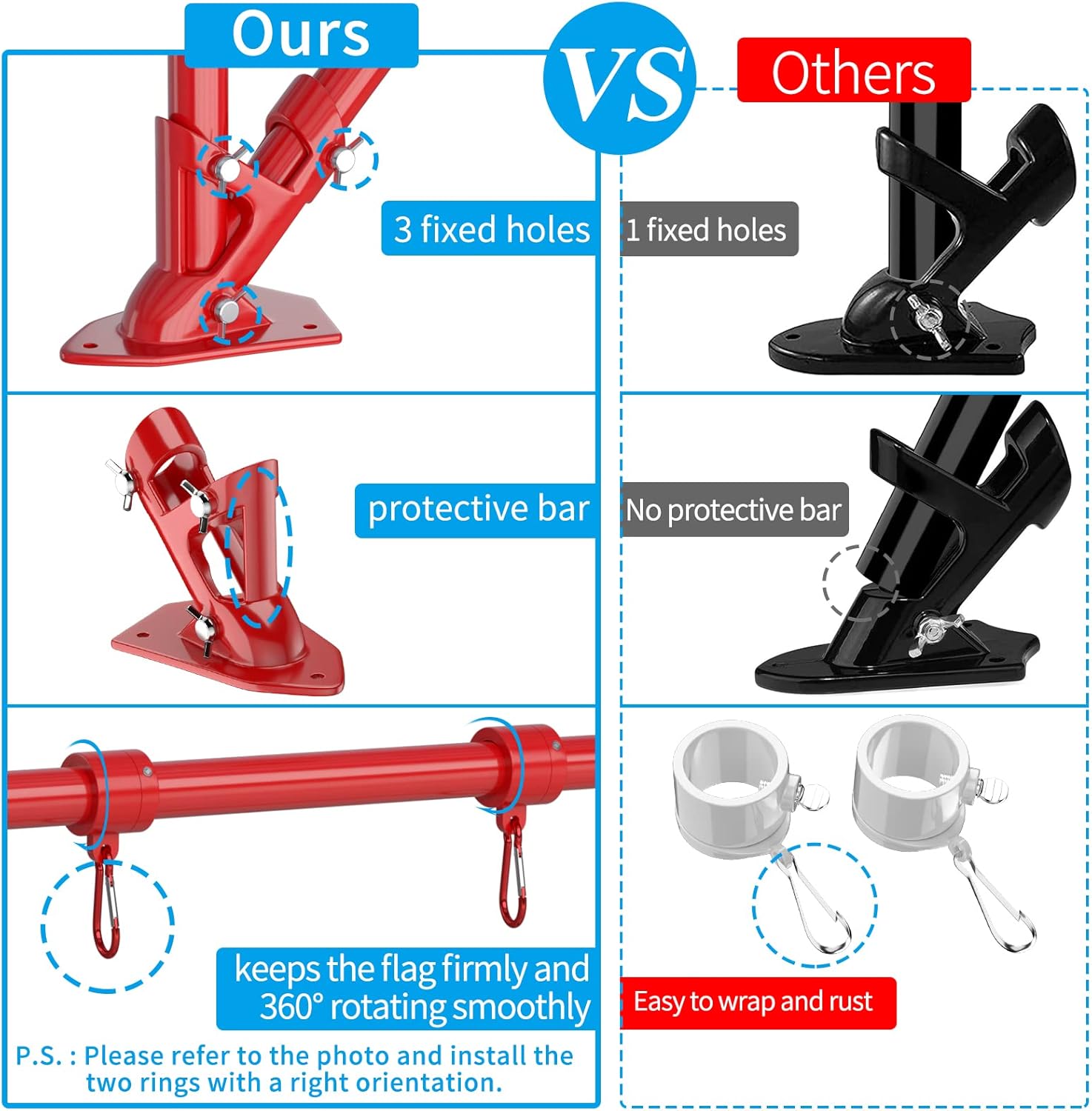- Unique Bracket: The high strength aluminum alloy flag pole holder for outside house has been upgraded with unique protective bar and 3 fixed holes to make the two-position (90° and 45°) flagpole more stable