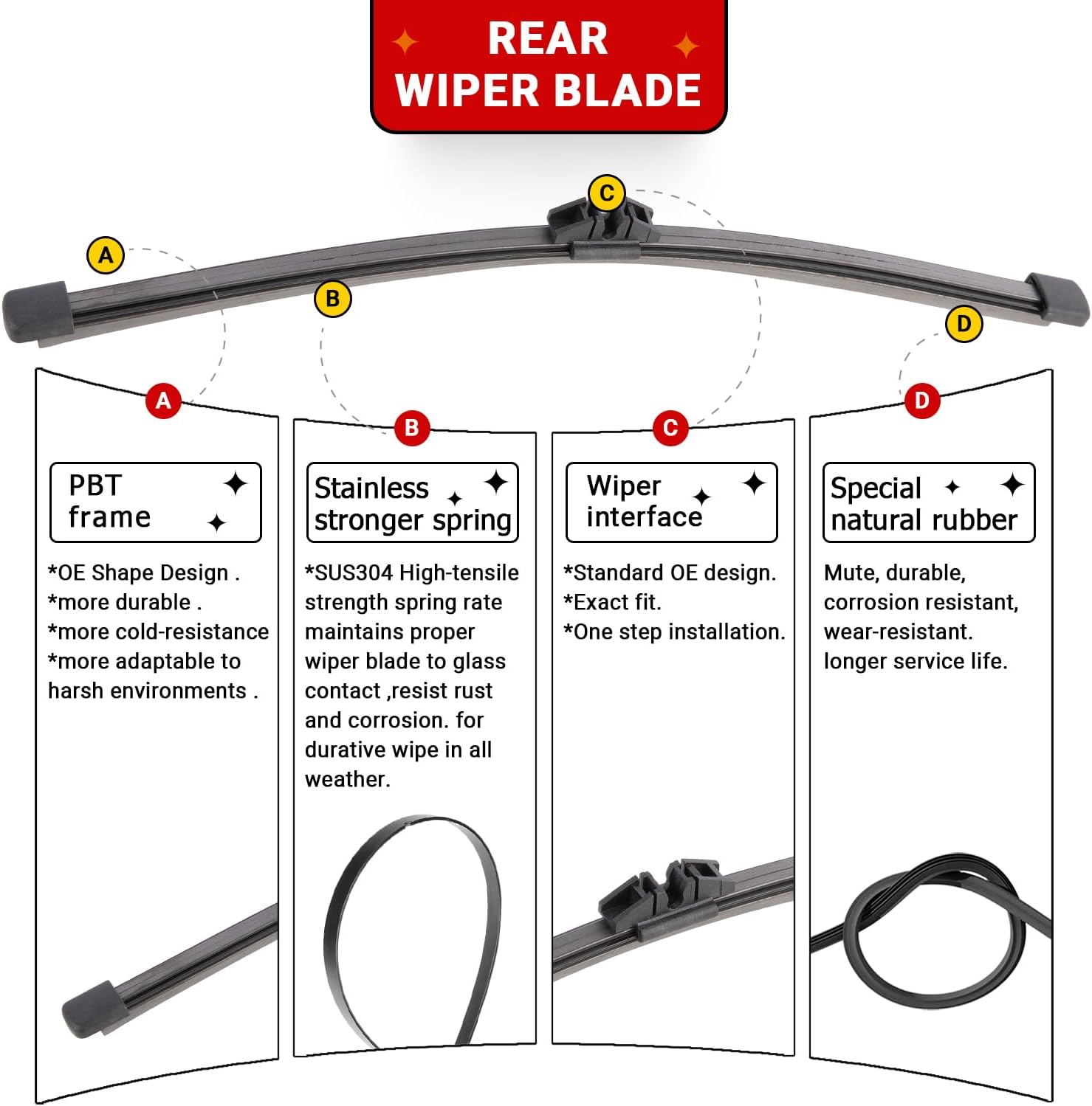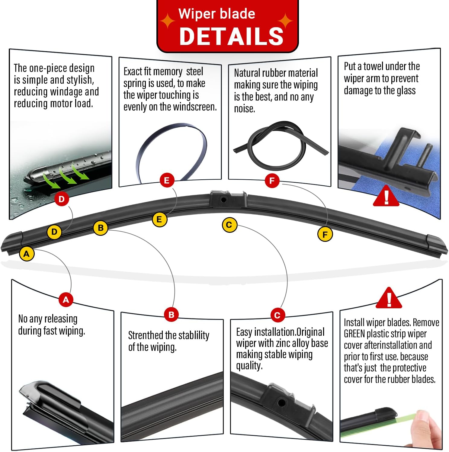 - {WIPER PERFORMANCE}: Natural rubber material making sure the wiping is the best, quiet wiping without judder or squeaking, resistant and a long service life.