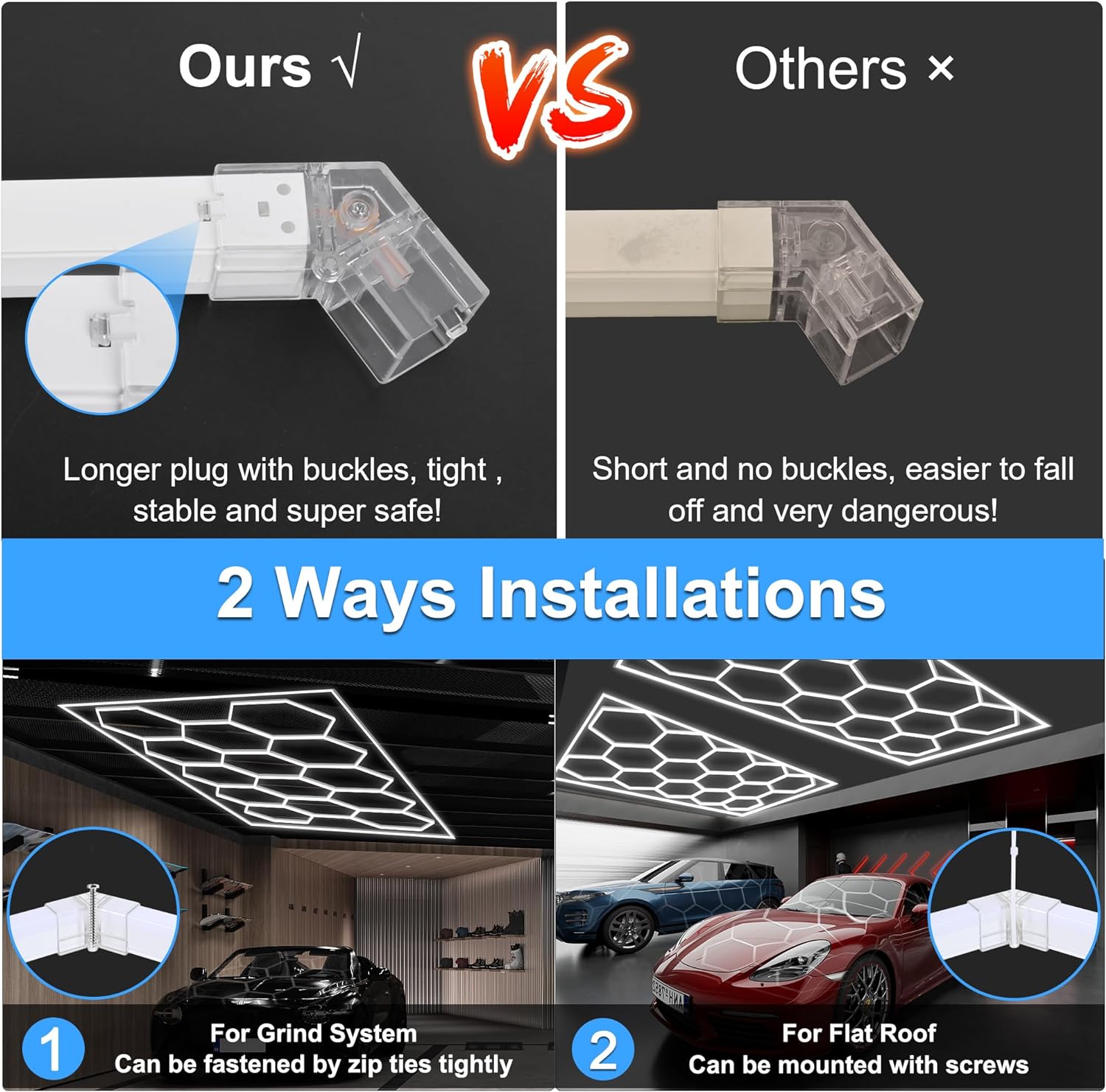 - 【Multiple Installation Methods】Our Hexagon Patterned LED Garage Lighting System offer two installation configurations for different walls. If the installation site is a smooth wall,install the lamps directly with screws. While if there is grid-type ceiling in your room,use zip ties instead of screws to fix the lights. Please ensure that you follow the proper installation instructions and take necessary safety precautions during installation.