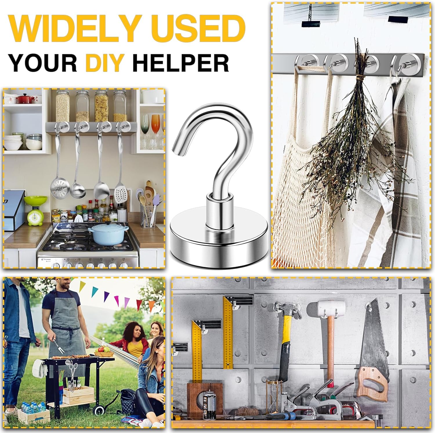 - 【Versatile Use】Super strong neodymium 80 lb magnets with hooks are perfect for hanging grill tools, decorative lights and tool accessories, also be widely used in cruise, fridge, kitchen, workplace office, garage, indoor, outdoor and anywhere there is iron or steel. No drilling holes, No sticky residue, No bolt or screws; Easy to install or remove and reusable.