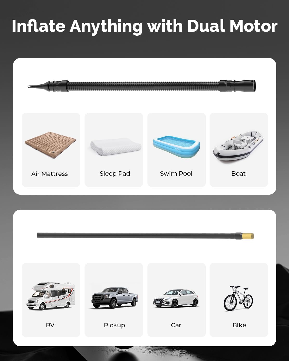 - ETENWOLF Vortex S6 cordless air compressor excels at inflating heavy-duty vehicles quickly, such as pickups, trucks, off-road vehicles, not to mention regular cars, bicycles, balls, pool floats, and air mattresses(Not for SUPs)