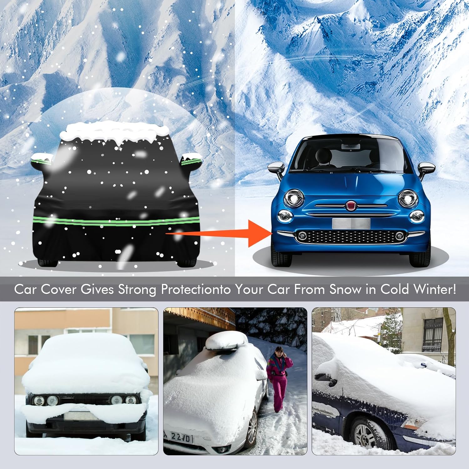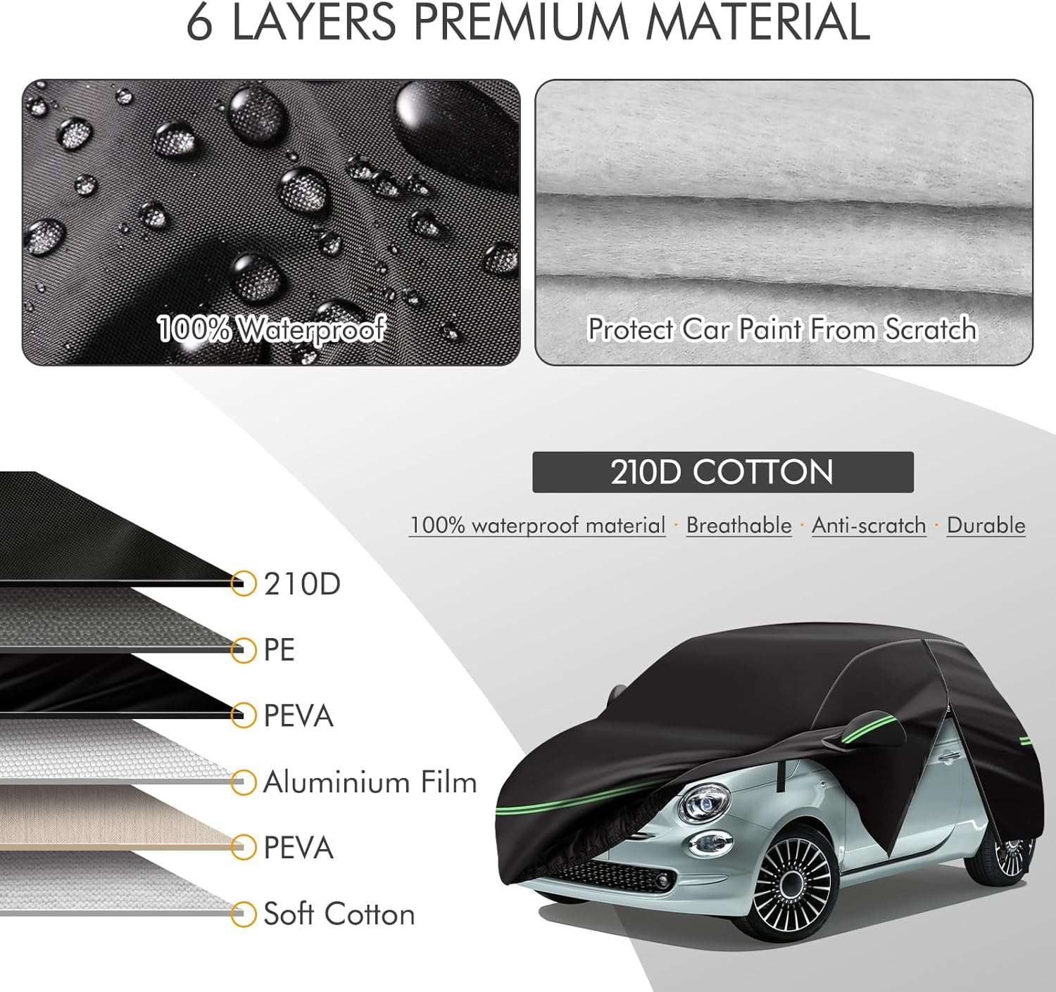 - 🚘【Premium Material】The car cover for Fiat 500/500C is made of heavy-duty 210D Oxford cloth and waterproof silver-plated fabric, and has multi-layer Cotton coating, which can be windproof, dustproof, UV-proof, sun-proof, not easy to tear, and withstand water pressure up to 1600mm. The inner layer also has a thickened cotton backing, which not only fully prevents the paint from being scratched, but also has thermal insulation, which is warm in winter and cool in summer.