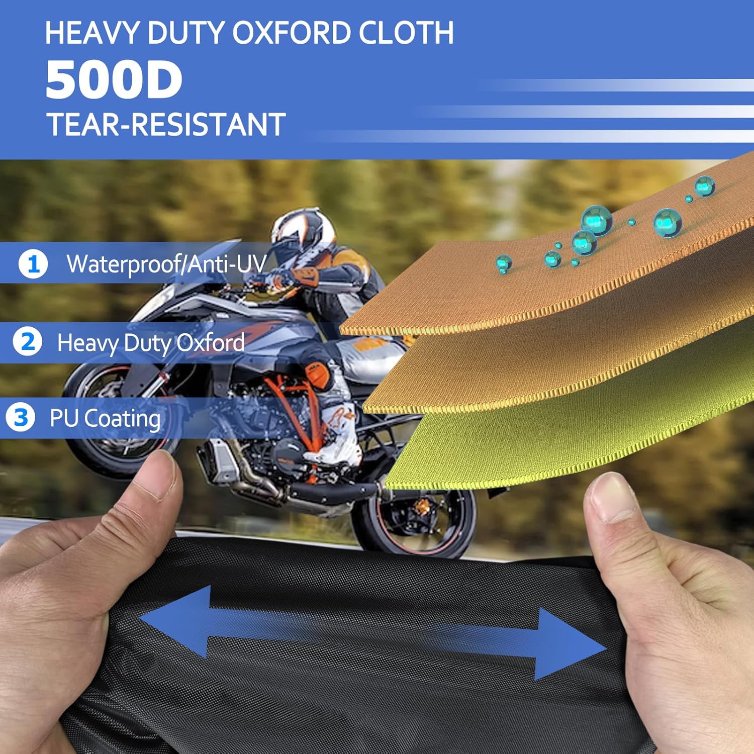 - 【Windproof and Waterproof】(1) Three windproof buckles under the cover are to make sure the cover stay in the place. (2) Front and rear Elastic hems on the bottom to keep the cover from being lifted by wind and for a snug and secure fit. In addition, One buckle on the cover is to adjust the tightness of the cover. (3) Double-stitched & Waterproof Strip make the motorcycle cover better waterproof, no water seepage.
