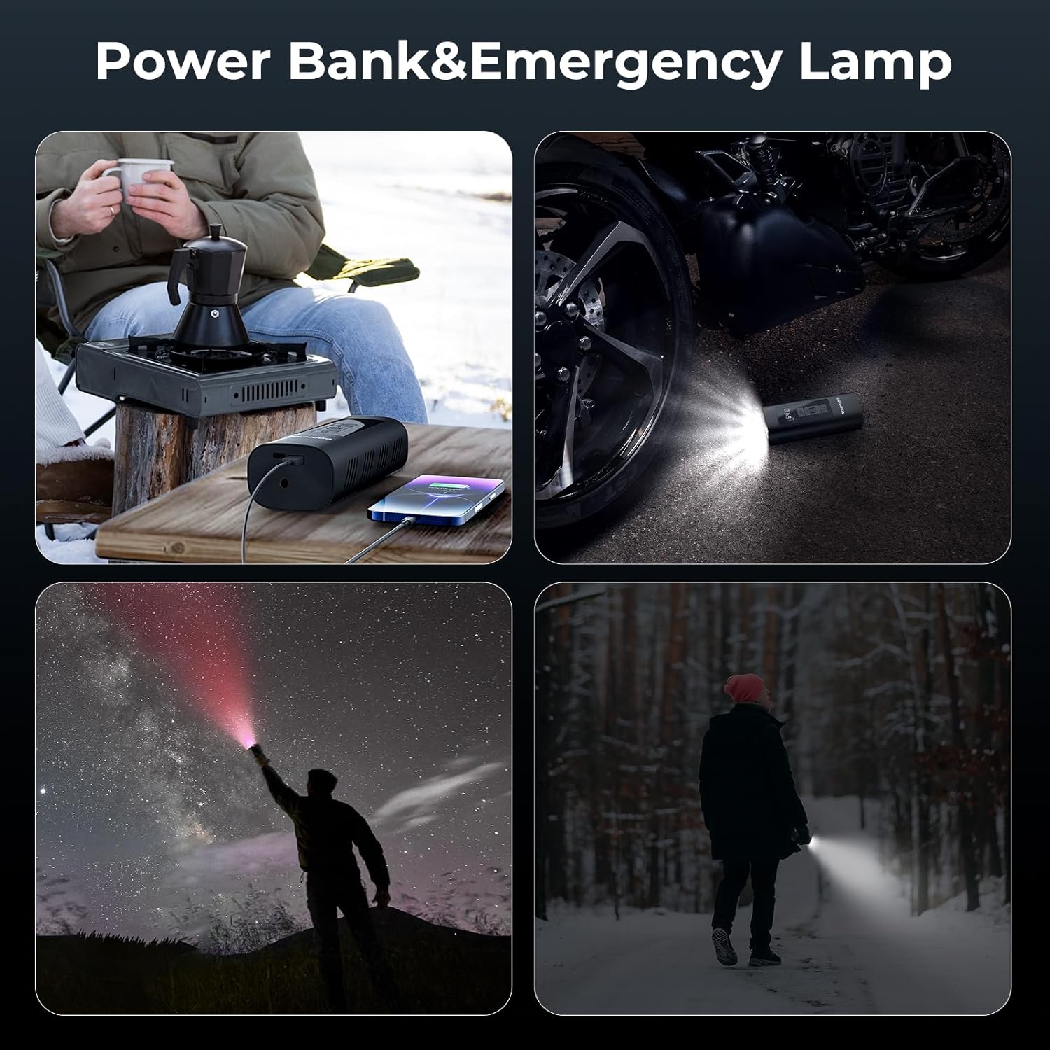 - 🚚【3 in 1 Device 】 Inflator, Power Bank and Flashlight. - In addition to serving as an portable air compressor, you can use it to charge your mobile phone, bicycle light, switching mechanism battery, etc. The top LED light (3 light modes) of this air pump which can be provided convenience for you to inflate and change tires in the dark, or warn other vehicles at night.