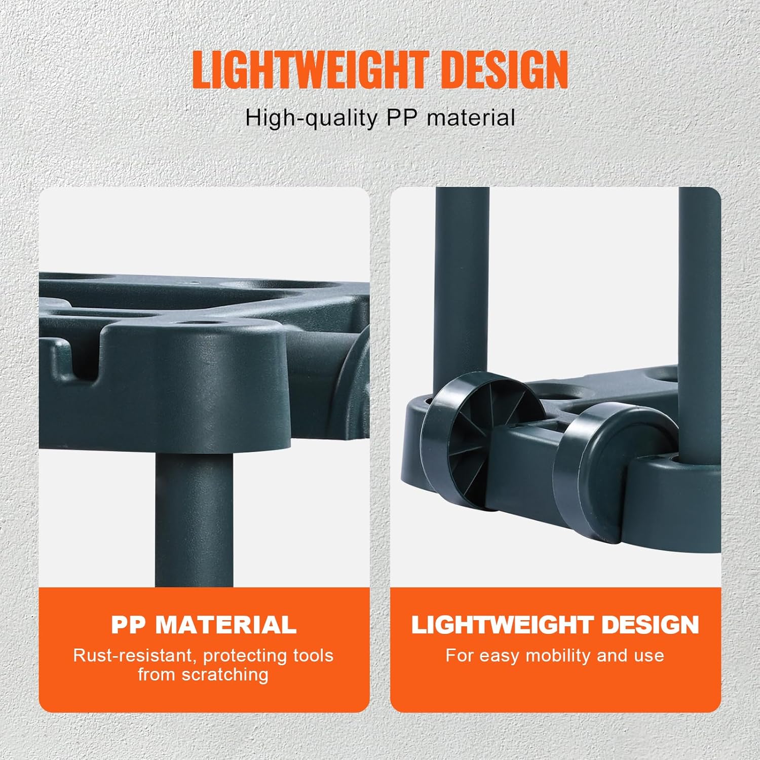 - Built to Last: Crafted from top-quality PP (Polypropylene) material, this lawn tool organizer is tough against the elements and wear. It weighs just 7.17 pounds (3.25 kg) with all parts included. The sturdy vertical pipes enhance stability and load-bearing capacity, making it easy to move while staying rock-solid.