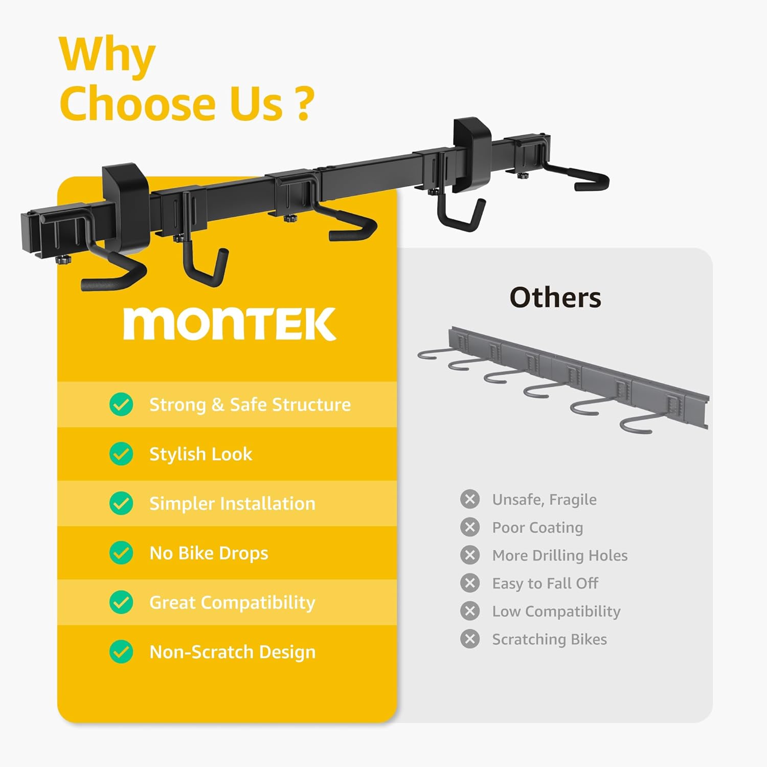 - 【PROFESSIONAL AFTER-SALE SERVICE】We are so confident in the quality of our wall bike mount that if you have any product issues, we're very happy to either provide a 100% Refund or a Replacement on your purchase! monTEK bicycle rack is designed by cyclists for cyclists and built to last. monTEK bike hanger wall mount is the best choice for the space saving storage feature you are looking for! Place the order NOW!