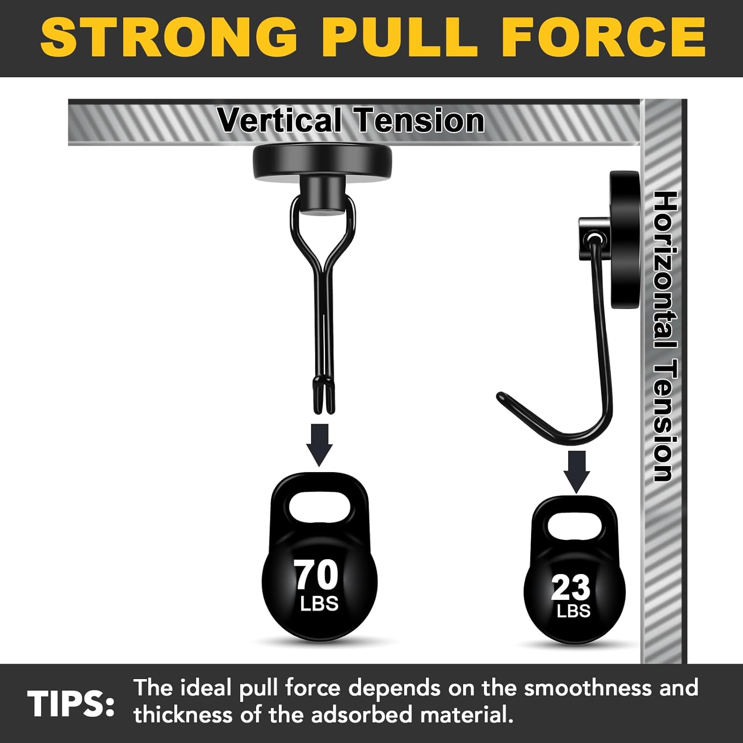 - STRONG HANGING CAPACITY: Heavy duty magnetic hooks are made of neodymium magnets offer more than 70lbs pull force on horizon, reduce to nearly 23lbs if used vertically. Our magnetic metal hooks will securely attach to any metallic surface