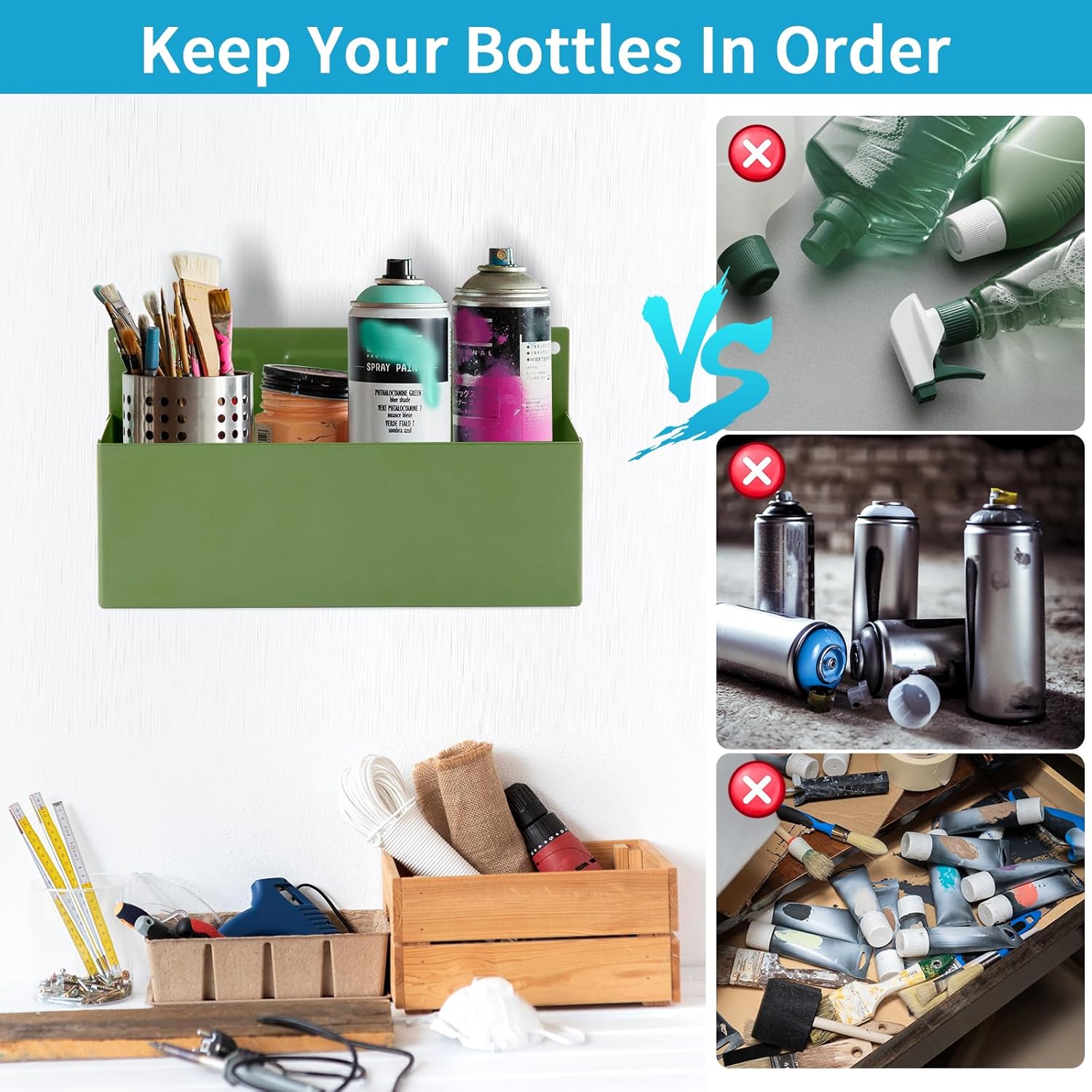 - Easy-to-Use and Clean: The spray can holder can hold at least 3 aerosol bottles within 3" diameter. The size is 8.3" x 2.8" x 3". Featuring an open design, this tool box allows for effortless tool retrieval and easy cleaning. Simply get what you need and go to work. Maintain a neat and organized workspace with ease.