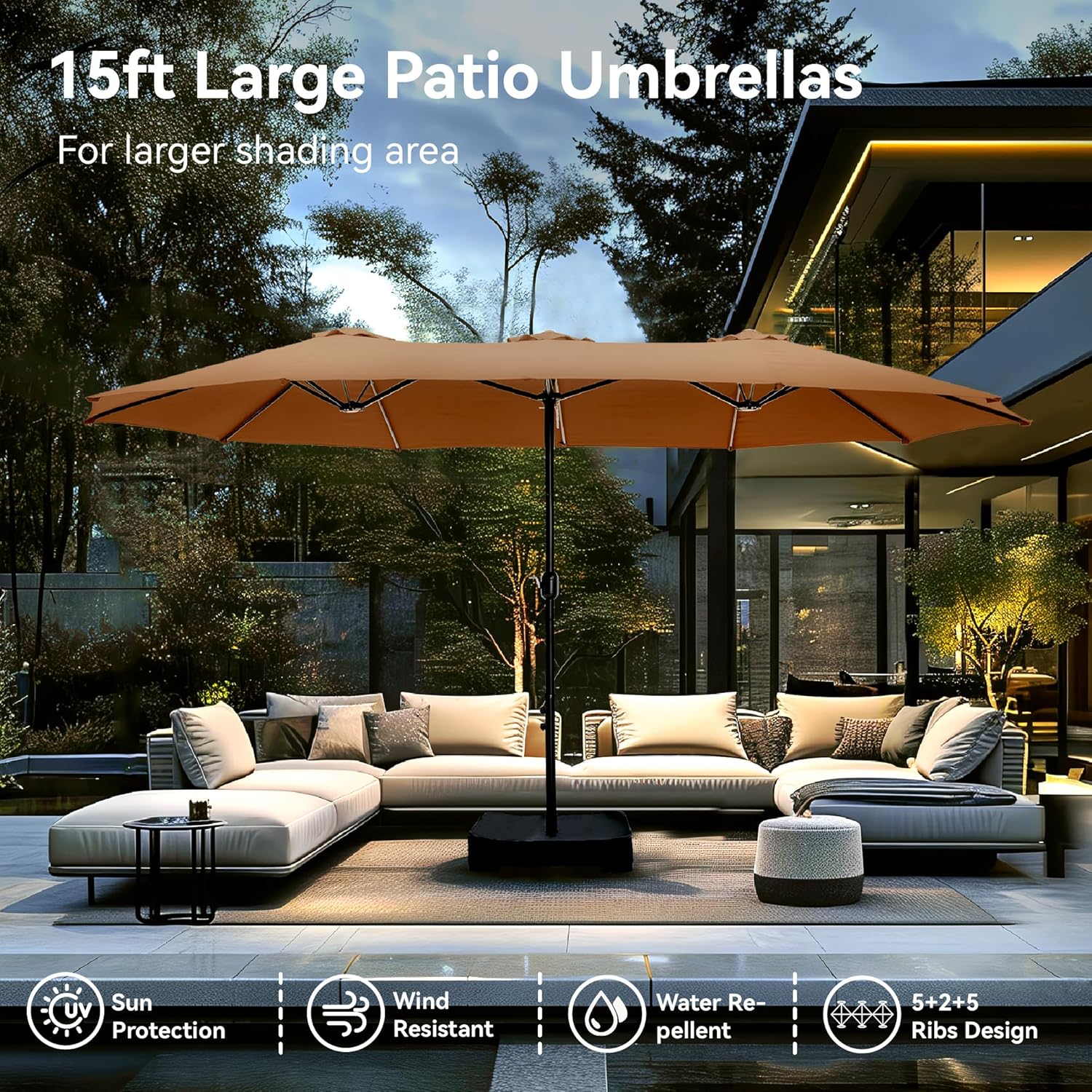 - User-Friendly Design: Enjoy hassle-free outdoor shade with our easy crank lift system for smooth opening and closing. This 15ft patio umbrella with base complements any patio furniture set perfectly