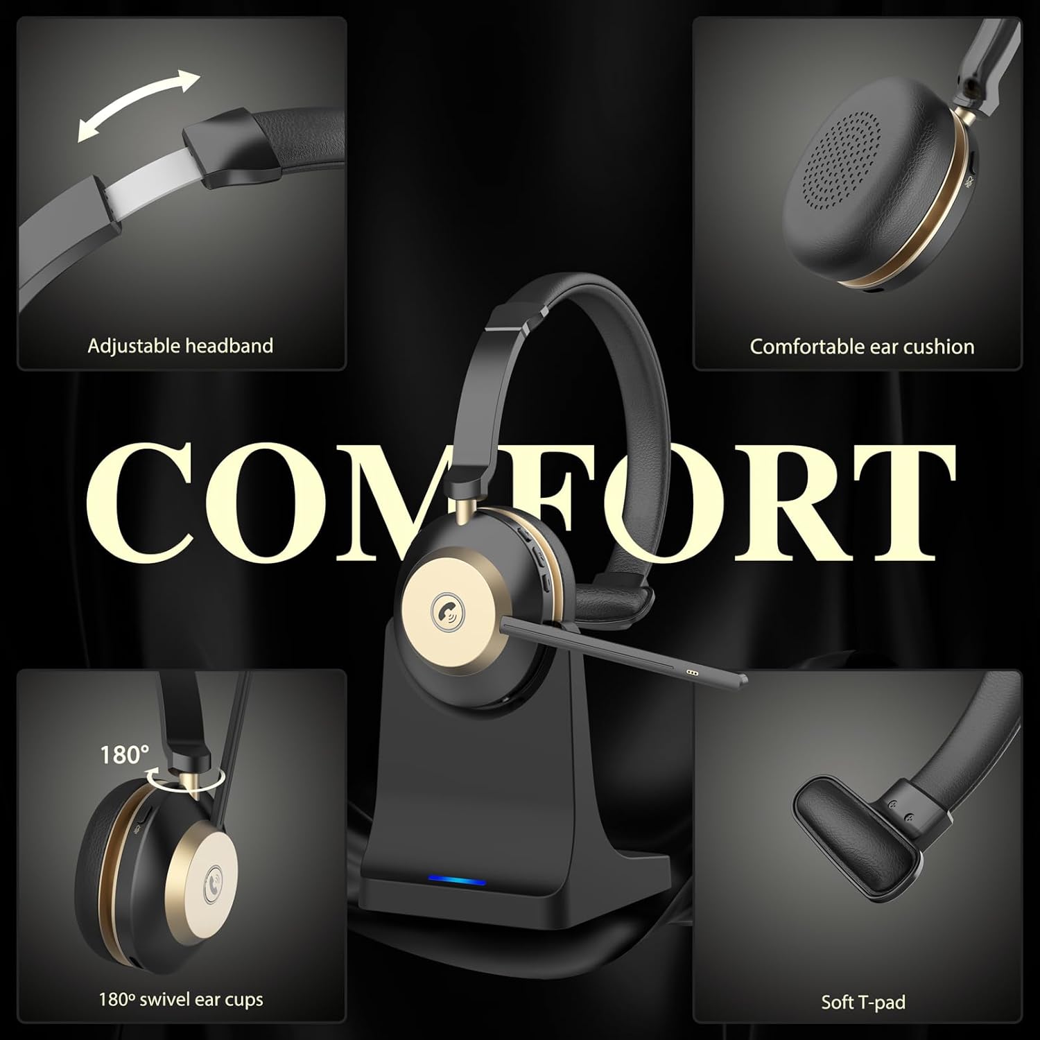 - 【Comfort & 45 Hours Talk Time】This lightweight bluetooth headphones with mic(125g) is designed for all-day comfort. The wireless pc headset features soft memory foam ear cushions, 180° rotatable ear cups, and a 270° adjustable noise-canceling microphone, allowing you to adjust to the perfect wearing angle. A 3-hour charge for the wireless headphones with mic provides up to 2 days of talk time and 1 week of standby time.