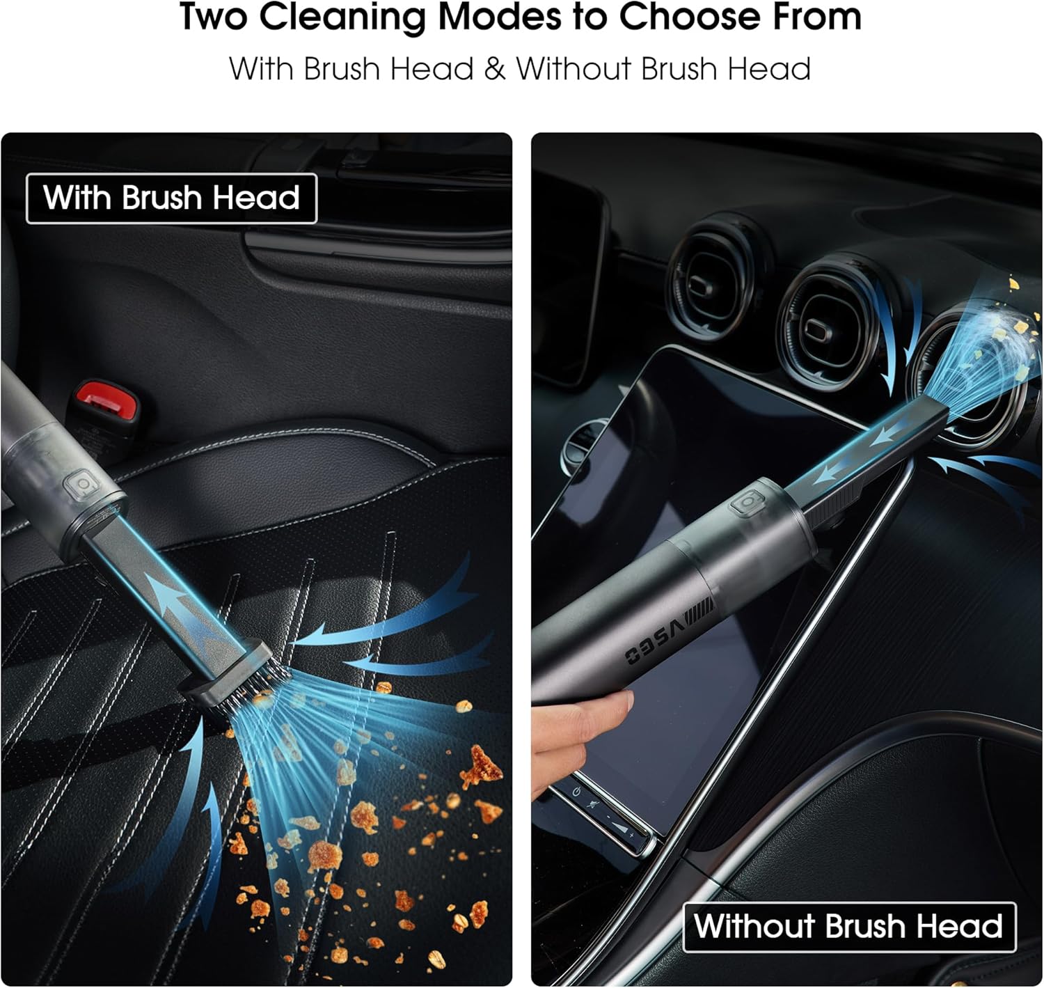 - 17000Pa Powerful Suction: Equipped with a powerful motor running at 100,000 revolutions per minute, the VSGO Handheld Vacuum Cleaner outperforms other products on the market by more than double, quickly clearing various debris inside the desktop, digital devices, car crevices.