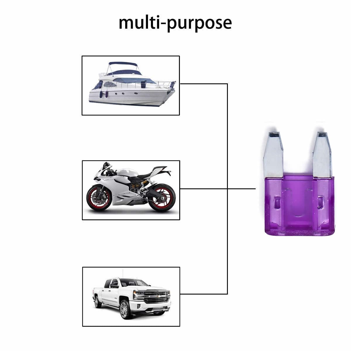 - WIDELY USE - These assorted fuses are specifically designed for Cars, Trucks, SUVs, ATVs, UTVs, Camper RV, Motorcycles, Fleet, Golf Car, Boat, snowmobiles, and most general DC applications etc., covering such components as radio, light, turn signals, etc.