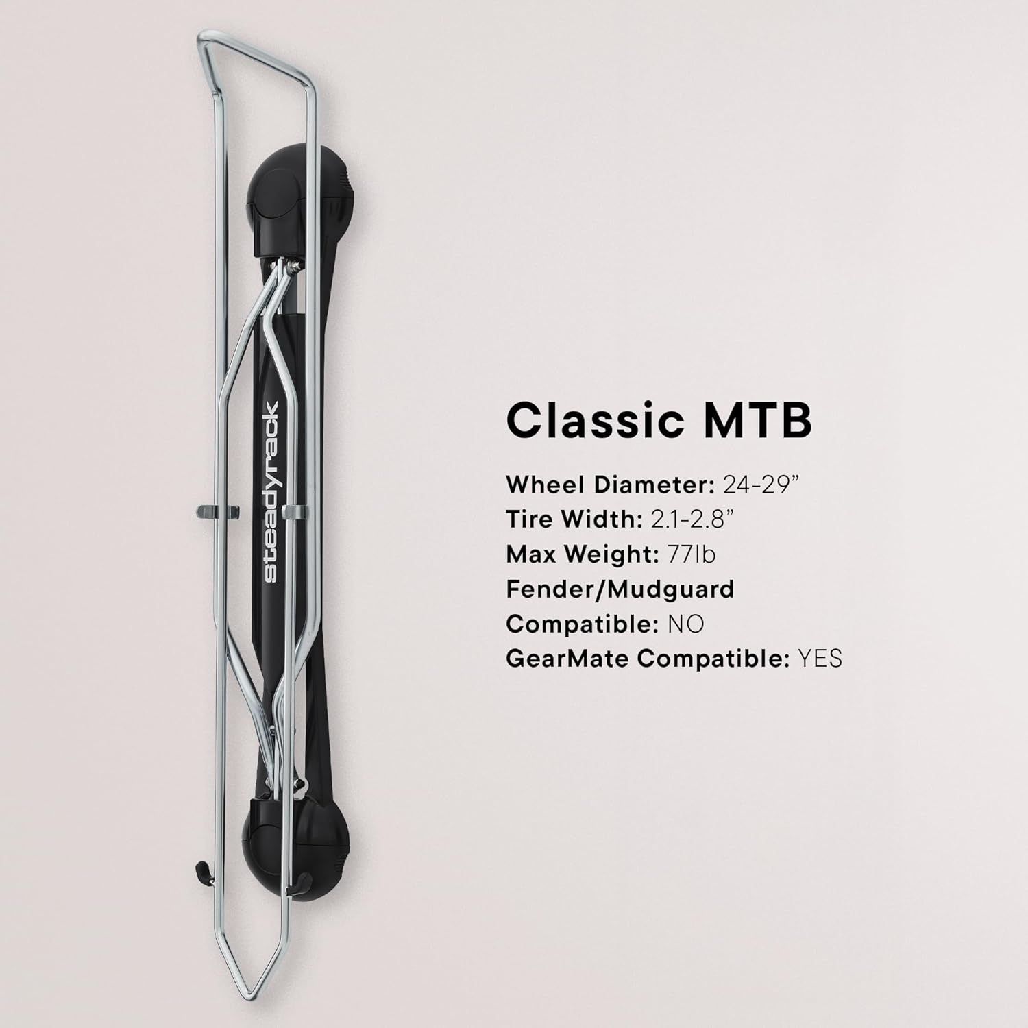 - Built for big bikes, trusted by riders – Since 2009, Steadyrack has led the way in vertical bike storage. The Classic MTB Rack is built tough for mountain and eMTB bikes, supporting up to 77 lbs with wheel sizes from 20"–29" and tires 2.1"–2.8" wide.