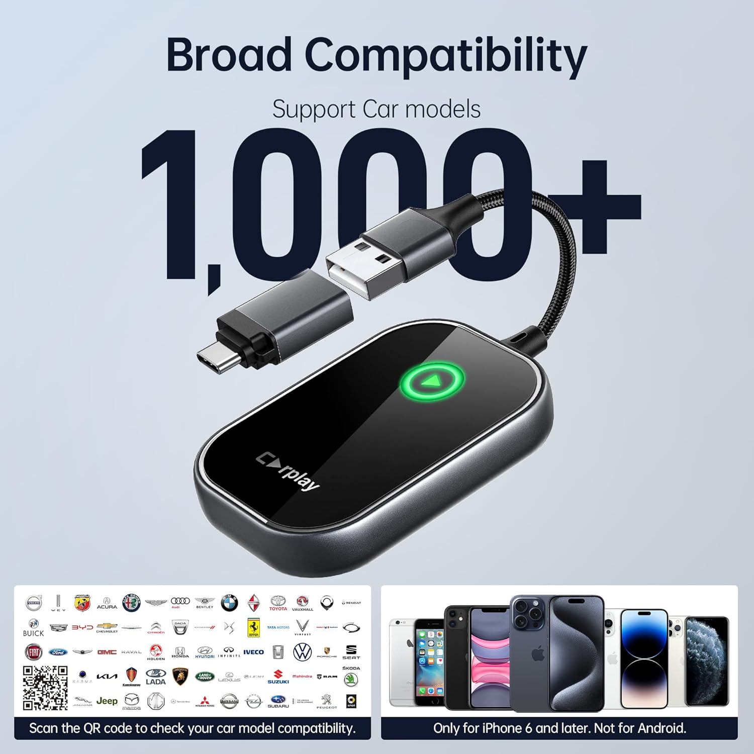 - Extensive Compatibility & Simple Verification: This Wireless CarPlay adapter is compatible with over 1000 car models and supports iPhone 6 and later models. (Note: It is designed only for cars equipped with wired Apple CarPlay, not other systems.) You can scan the QR code to verify if your car is compatible with our Wireless CarPlay adapter