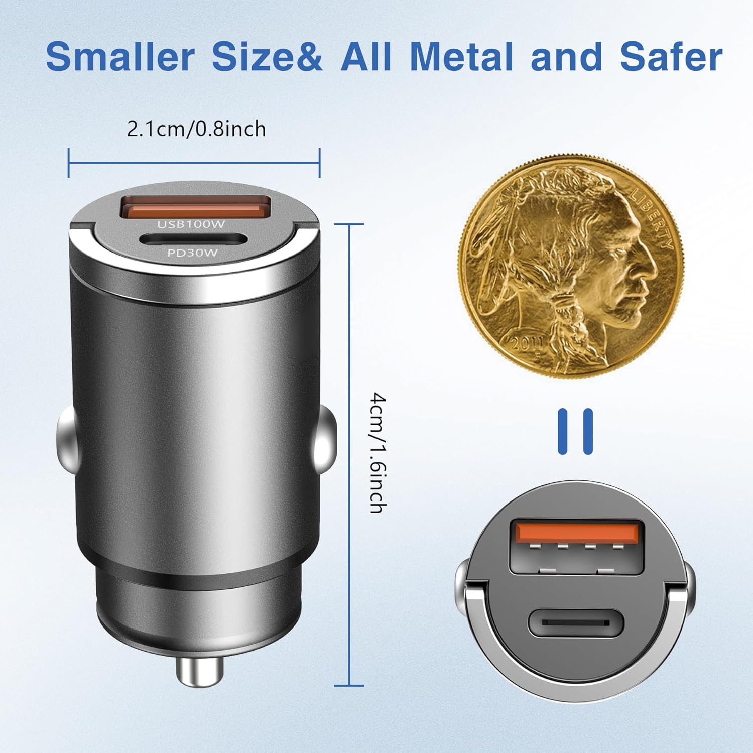 - ✅【All Metal, Smaller and Safer】The high-density aluminum alloy shell can help the car charger to dissipate heat in the charging process, effectively improving the charging efficiency by about 30%, and absolutely no melting and danger. The all-metal body also has a unique sense of design and luxurious texture.