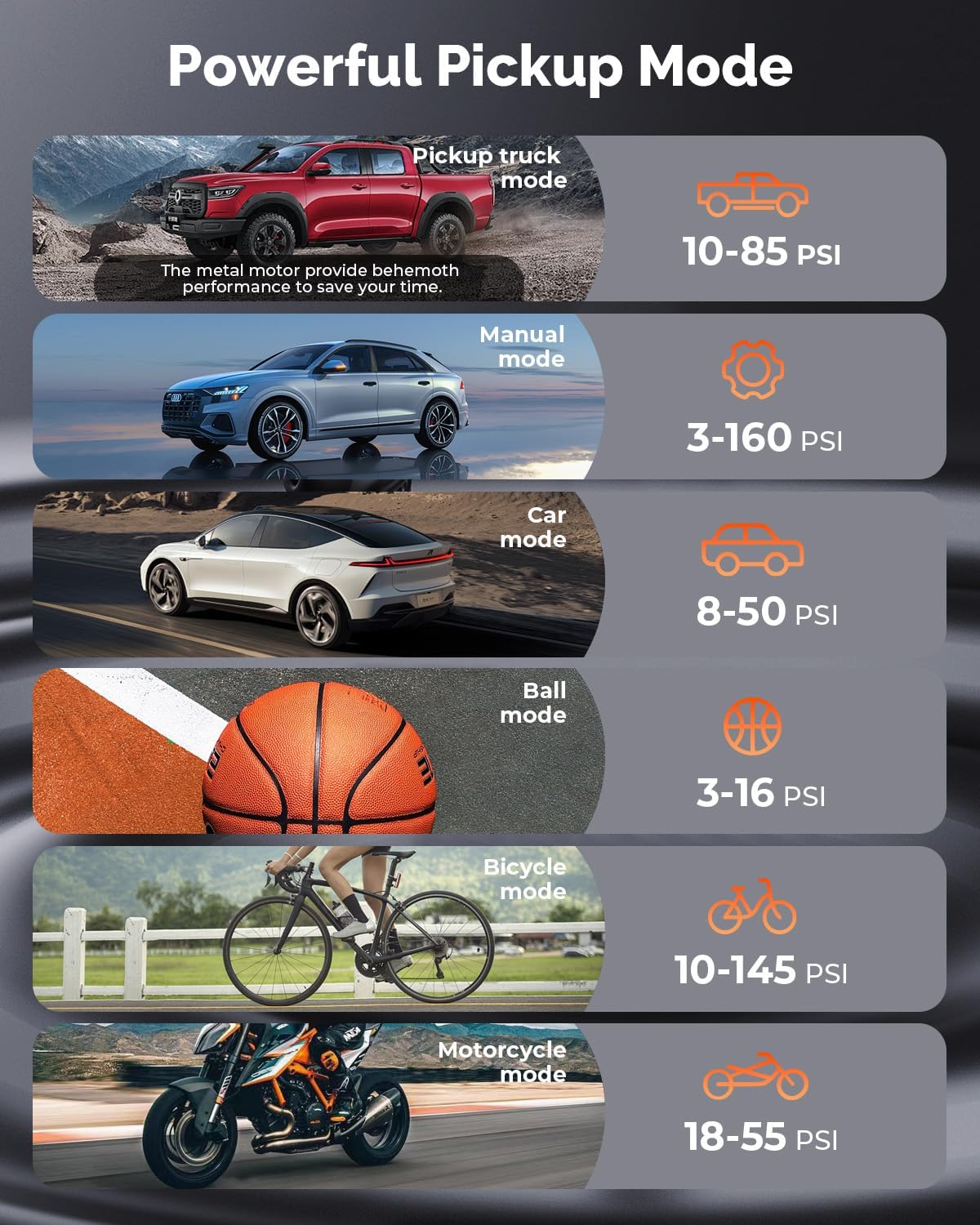 - 6 Inflating Modes & One Click Preset:Zephyr S5 is a portable tire inflator offers 5 preset inflation modes (car, motorcycle, bicycle, ball, customize mode and with an exclusive pickup truck mode) and 3 preset units (PSI, KPA, BAR). Just one click to select the desired inflation mode. At the same time, the manual mode allows for adjustable air pressure values ranging from 3-160 PSI, making it suitable for various vehicle types and balls, providing you with an all-in-one inflation solution.
