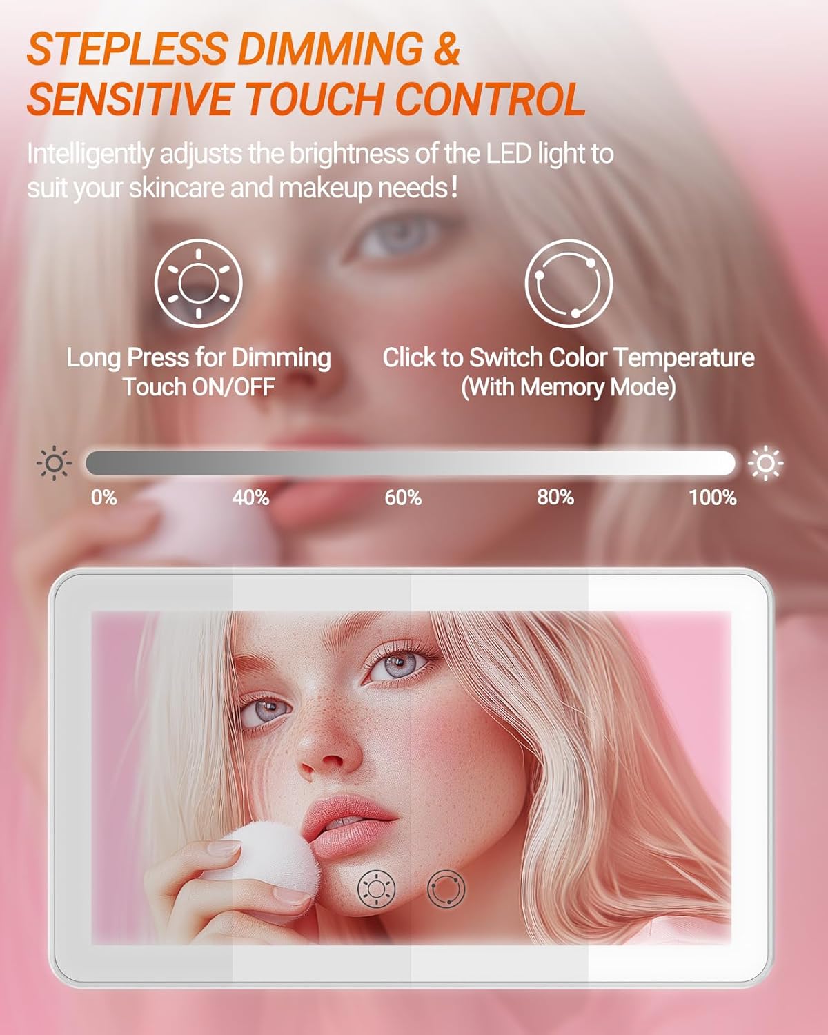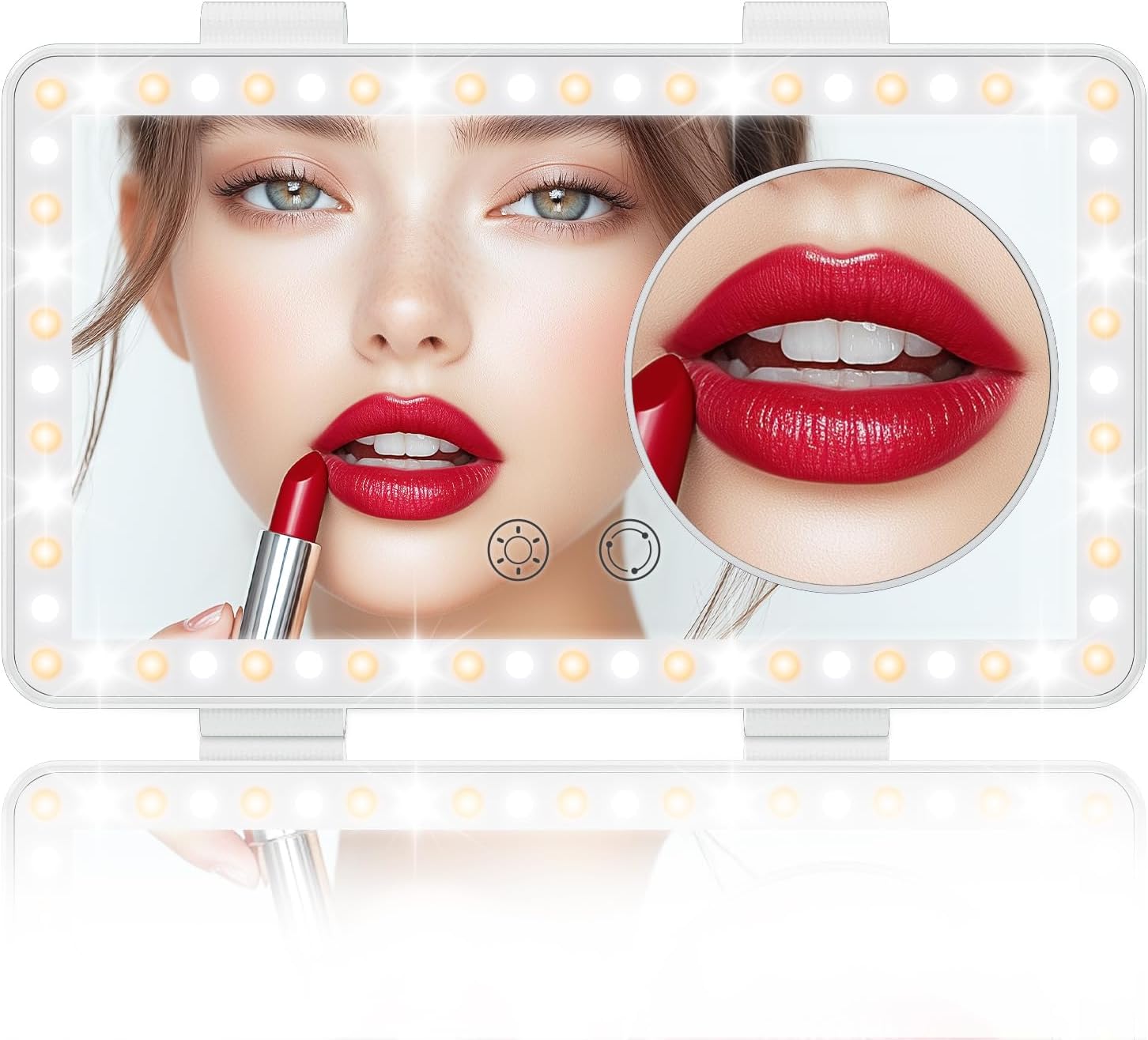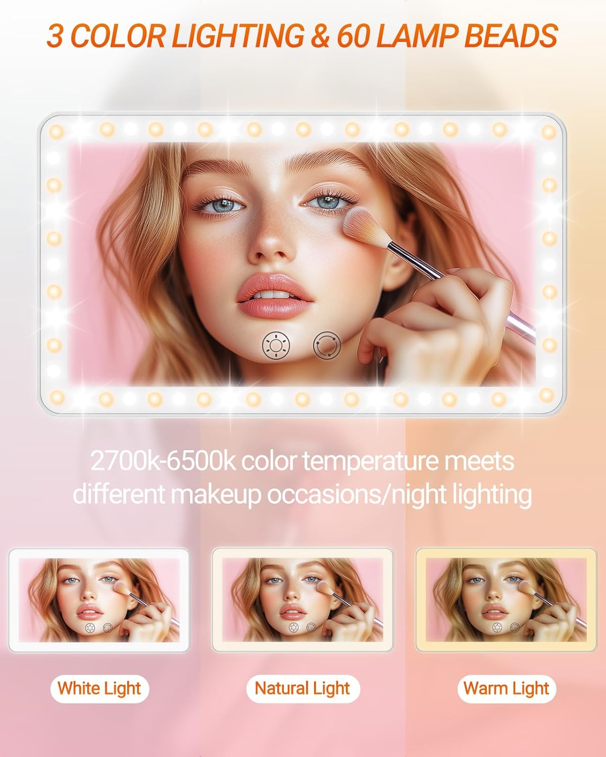 - 🫧【3 Modes of Lighting & Dimmable】LED car mirror has 60 uniform, glare-free LED lamp beads (30 white lights + 30 yellow lights), which are 40% brighter than ordinary bulbs and consume 60% less energy. Short press to switch between three light colors: white, yellow, white and yellow, long press for infinite dimming. 2700-6500 K color temperature is equivalent to outdoor sunlight, so your makeup looks natural and flawless.