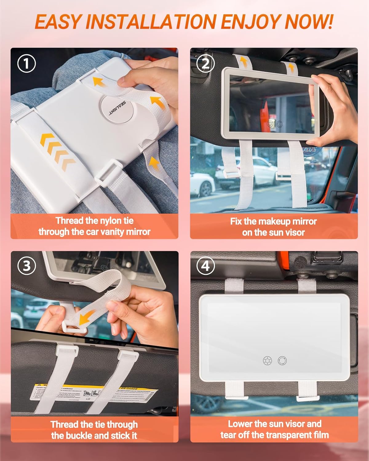 - 💃【1X and 3X magnification】SEALIGHT car vanity mirror has 1X and 3X mirrors with suction cups, making makeup and facial care easier. You can see your entire face in the 1X mirror, or you can see specific parts in the 3X mirror to create a more refined makeup. (Please keep a distance of about 4 inches when using the magnifying mirror to avoid dizziness)