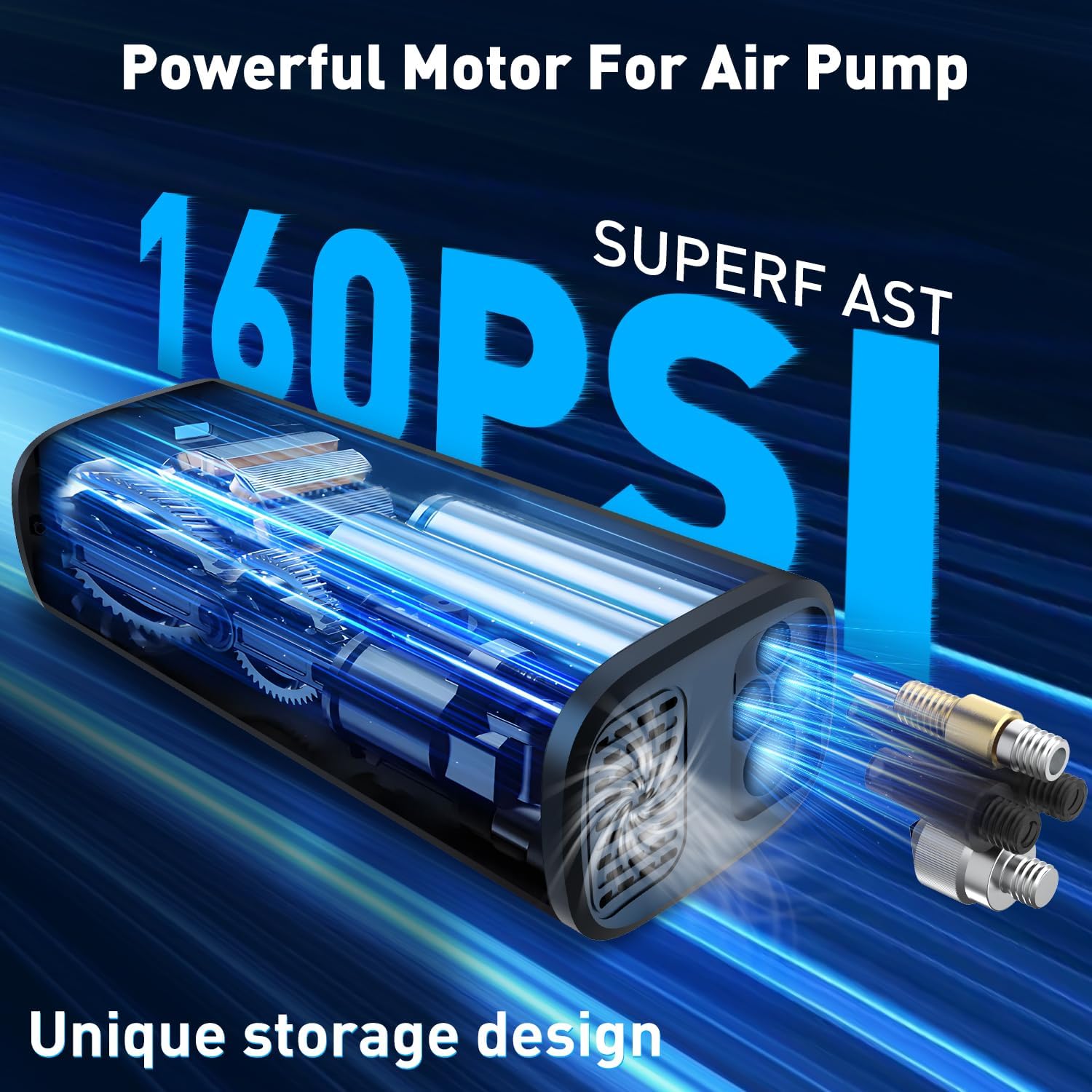 - 【Complete Accessories and Unique storage design】 The easy-to-carry portable air compressor for car comes with a storage bag and assorted accessories. In addition, the bottom of the electric air pump is designed with a unique accessory storage compartment, bidding farewell to the situation of messy, difficult to store, and easily lost accessories, bringing a more enjoyable user experience.