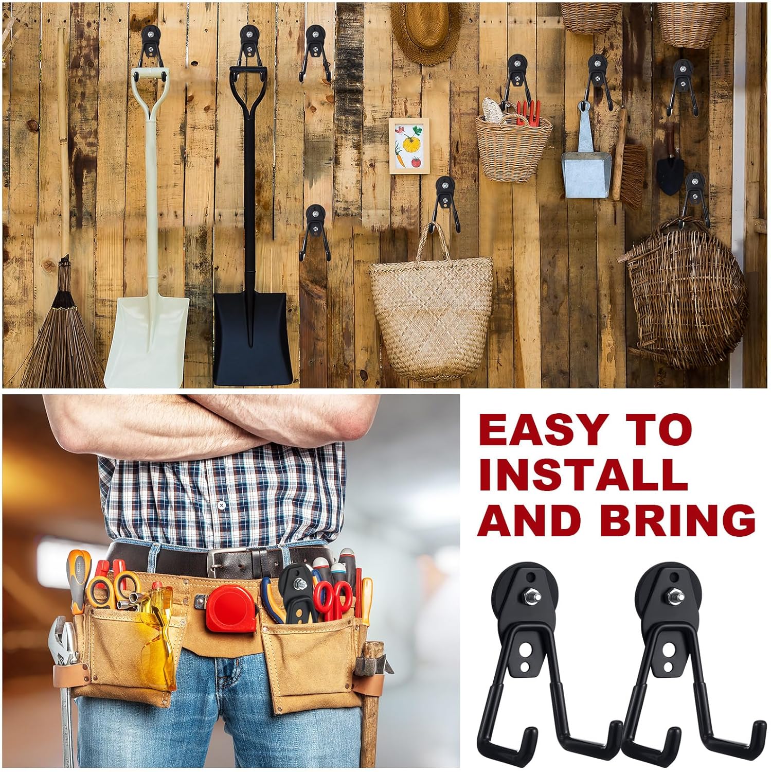- Wide Range of Usages: compared with the single hook, our garden tool hooks have 2 holes, which can easily support the weight and can hang most items; Applicable to scenes such as kitchens, garages, warehouses, offices, etc. which can accommodate various tools and equipment, such as hoses, skates, gym bags, shovel, rake, broom, mop and other garden tools