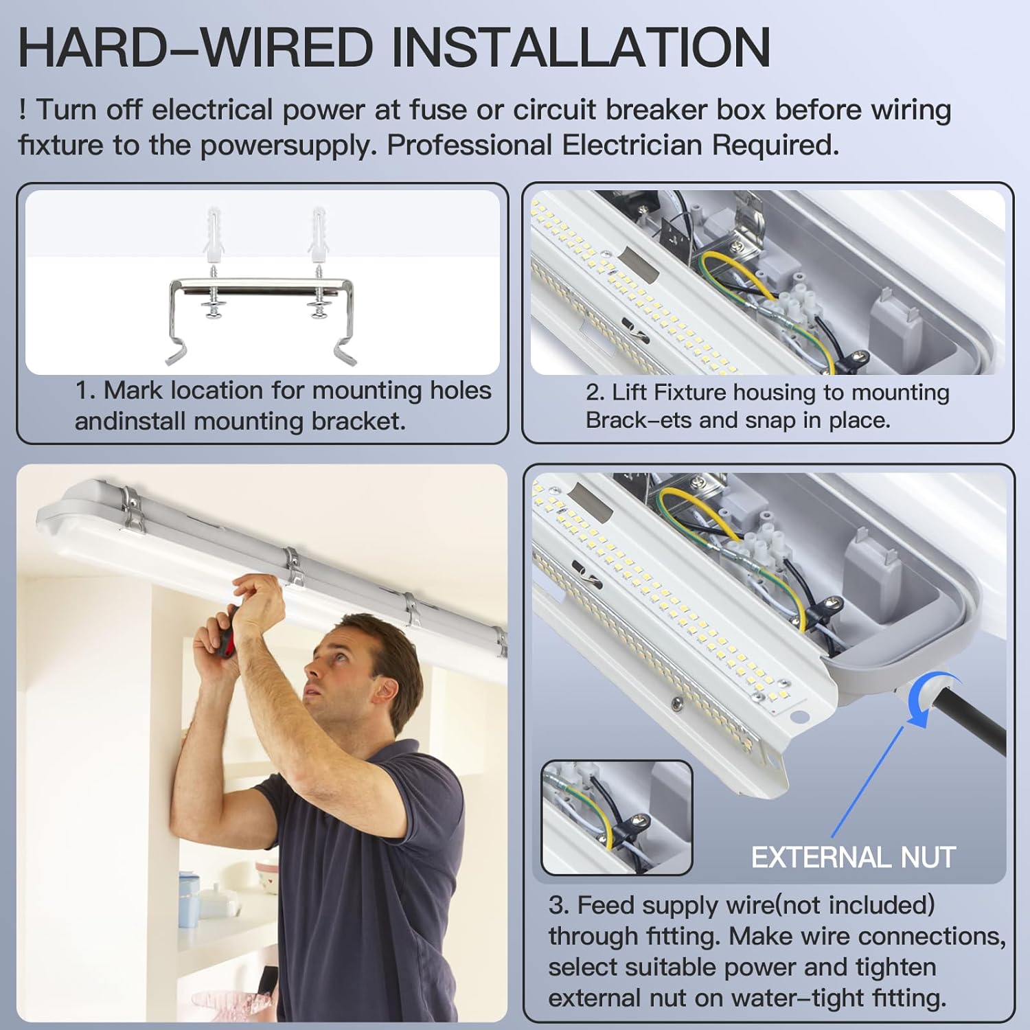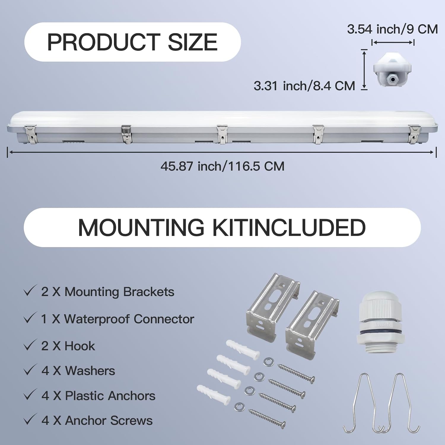 - 【Quick and Easy Installation】 Transform your space in just 3-5 minutes with our 4ft LED fixtures. Simply follow 3 easy steps to surface mount these hermetic fixtures. Mounting Bracket and screws included for Wall Surface Mount. There is also one cable gland provided for waterproof cable connection (Cable NOT included).