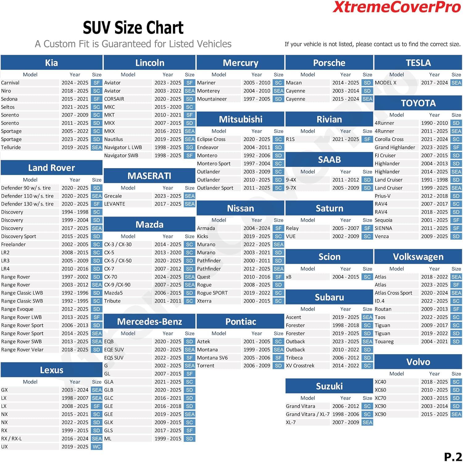 - Coverage : SUV - Full Exterior Coverage (QX80, Sedona, MKT, Traverse, Enclave, Durango, LX570)