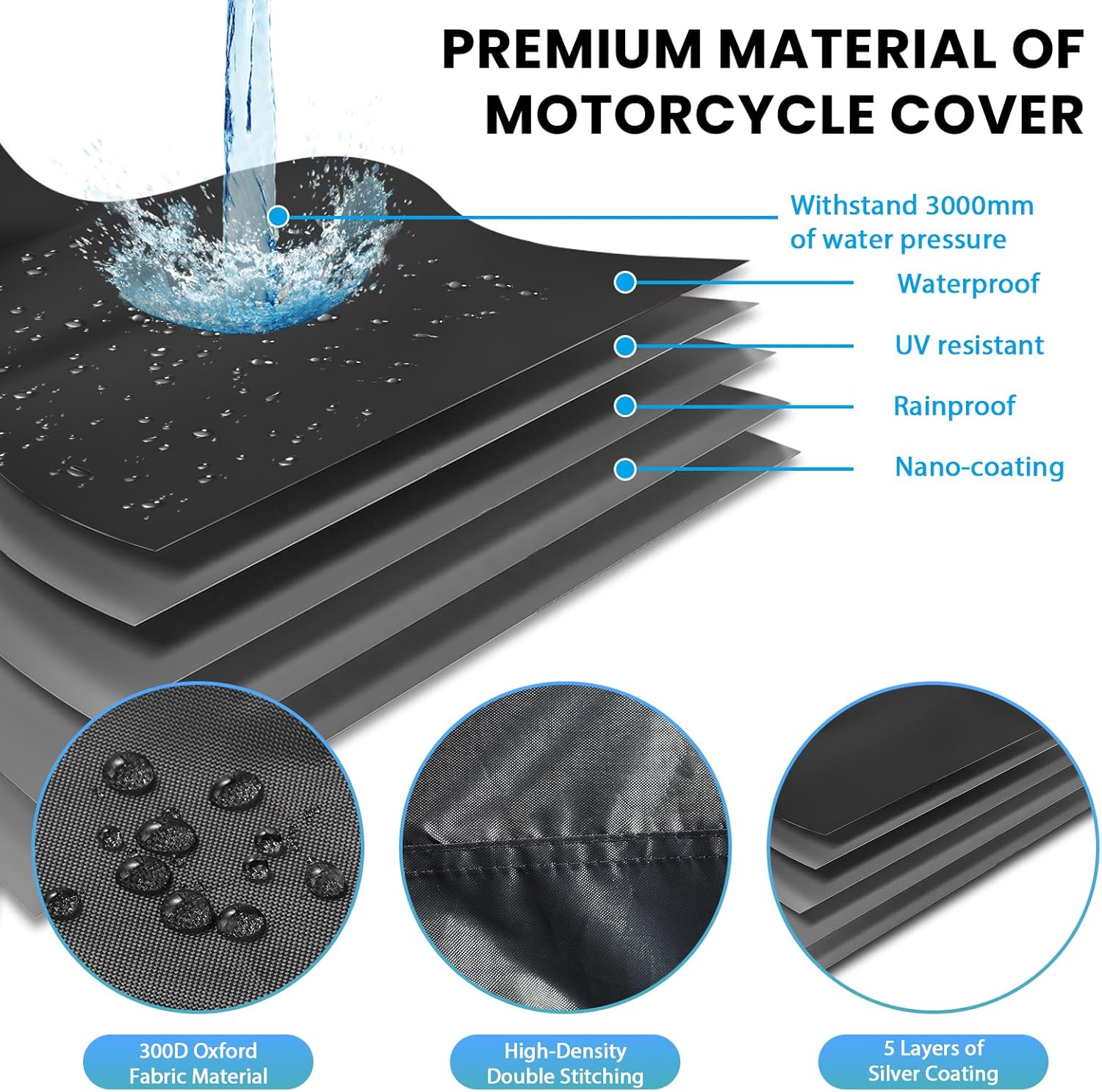 - 300D Waterproof Material: The motorcycle cover is made of 300D Oxford waterproof fabric with silver coated lining, combined with double stitching and internal waterproof strips, it's more smooth and waterproof, which can protect your bike from wind and rain as well as from UV rays, dust, falling leaves or other natural weather. PLEASE NOTE: Please don't use sharp decorations or car mirrors against the seams, easy to tear. Try to keep it indoors before a storm as a way to increase its lifespan.