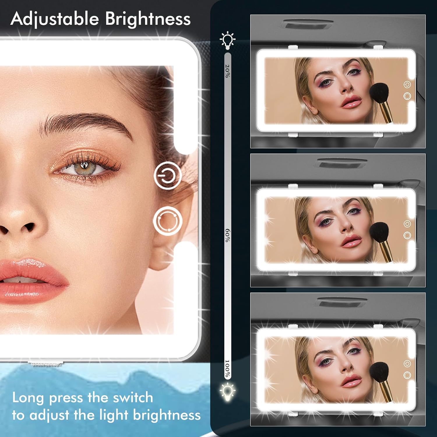 - 【Versatile Lighting Options】 With a simple short press of the touch-sensitive switch, you can seamlessly switch between three light colors: crisp cold light, natural daylight, and soft warm light. This allows you to choose the lighting that best suits your needs, whether you're applying makeup in bright sunlight or dim evening conditions. For even more tailored brightness, simply long press the switch to adjust the intensity according to different environmental needs. This offers ultimate versatility, ensuring that you always have the perfect lighting for your beauty routine.