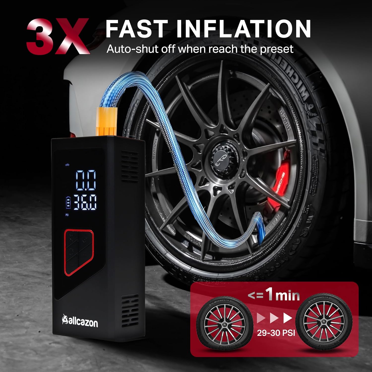 - Digital Display and Preset Tire Pressure Gauge: The digital display on the ALLCAZON tire inflator allows you to set and monitor tire pressure accurately. With preset options and an automatic shut-off feature, this air compressor with tire inflator gauge ensures your tires are inflated to the perfect PSI, making it easy to avoid overinflation.