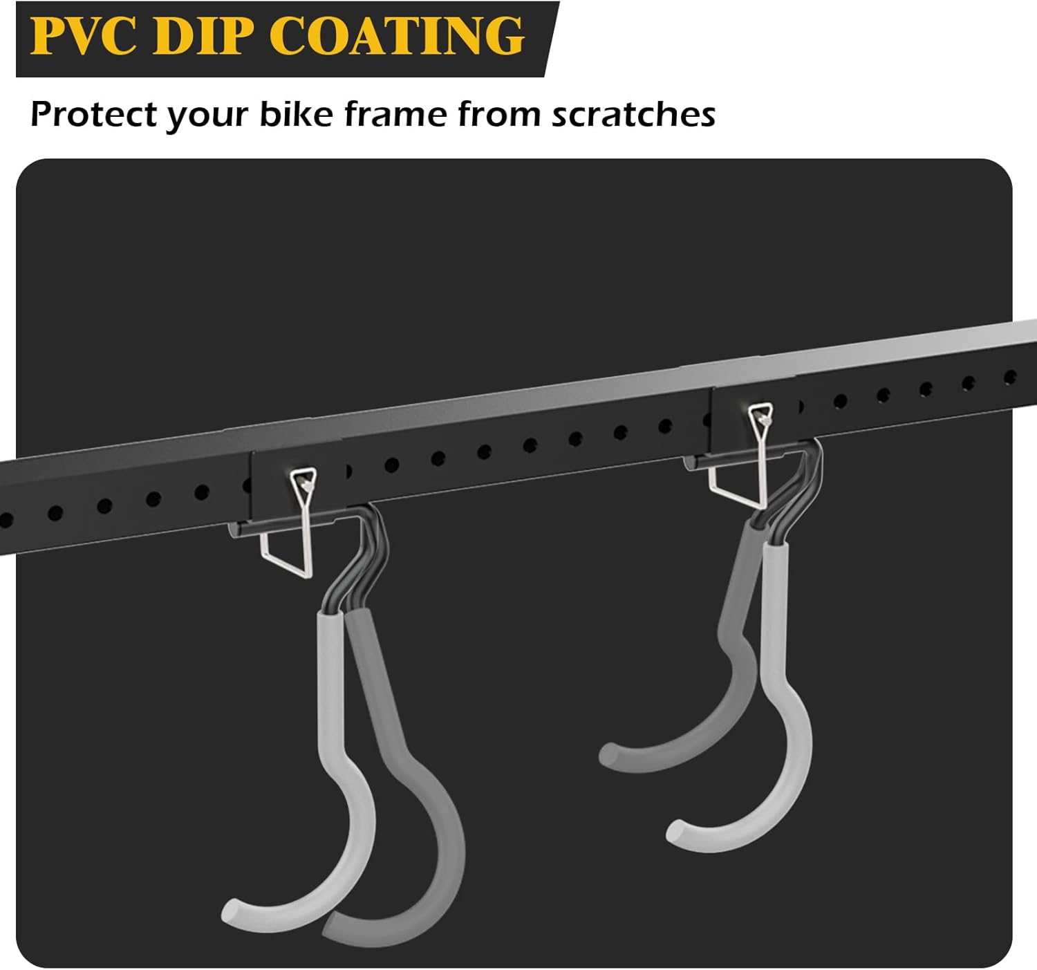 - STURDY STRUCTURE: Our multi-functional bike storage rack have 2 tracks and 8 hooks, giving you enough space to freely choose and display or hang your bicycle. Each hook can bear 80 pounds, and the total load capacity can reach 640Lbs.