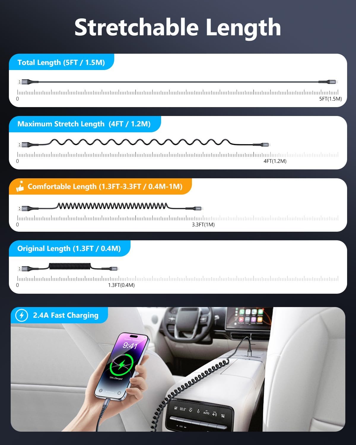 - 【Coiled Lightning Cable for Car】Retractable iPhone charger cable with spring-shaped design, anti-tangle. Compact and portable solution to keep your car console neat and organized; stretches up to 2-3 feet when needed and easily returns to its original 1-foot length.