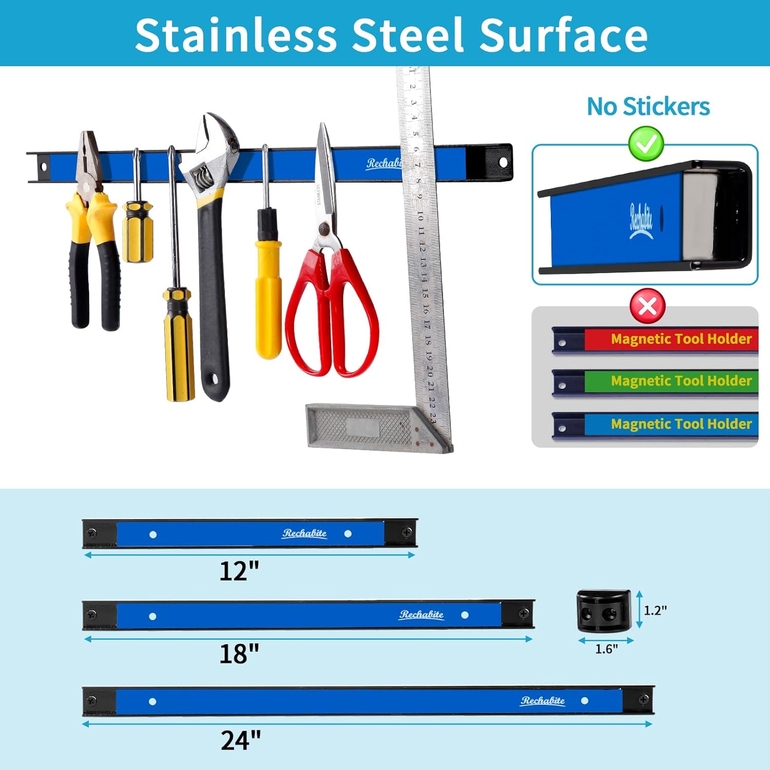 - BENEFITS FEATURES: Magnetic tool strip is extendable to meet your versatile needs. Rechabite magnetic tool holder covered with stainless steel surface, no stickers, it is clean design and suitable to match anywhere. Easy to use--strong magnet but with a simple tug, you can release any tool for use.