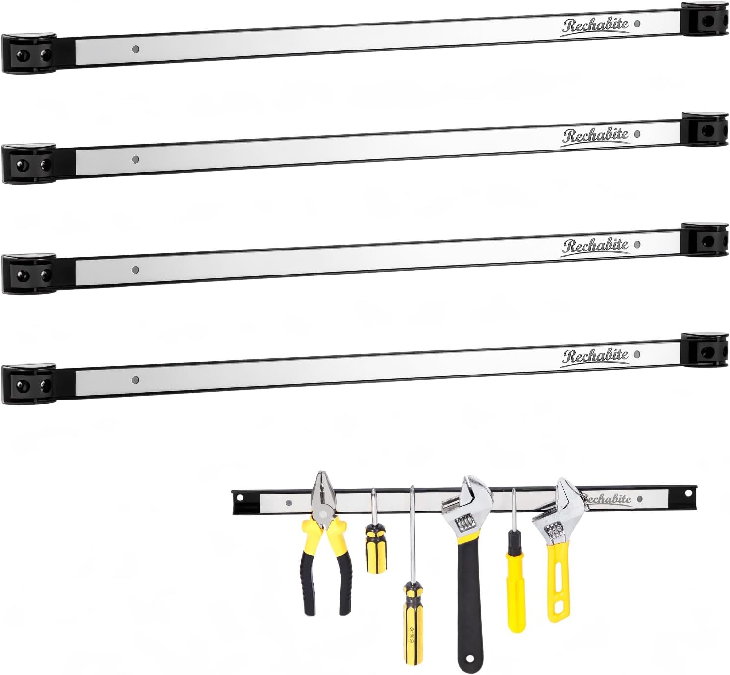- MAGNETIC TOOL HOLDER SET: Rechabite magnet tool organizer set includes 4 pieces 24" magnetic tool bars, comes with 8 mounting brackets, screws and anchors. Each magnetic tool strip is extendable with each other connected.