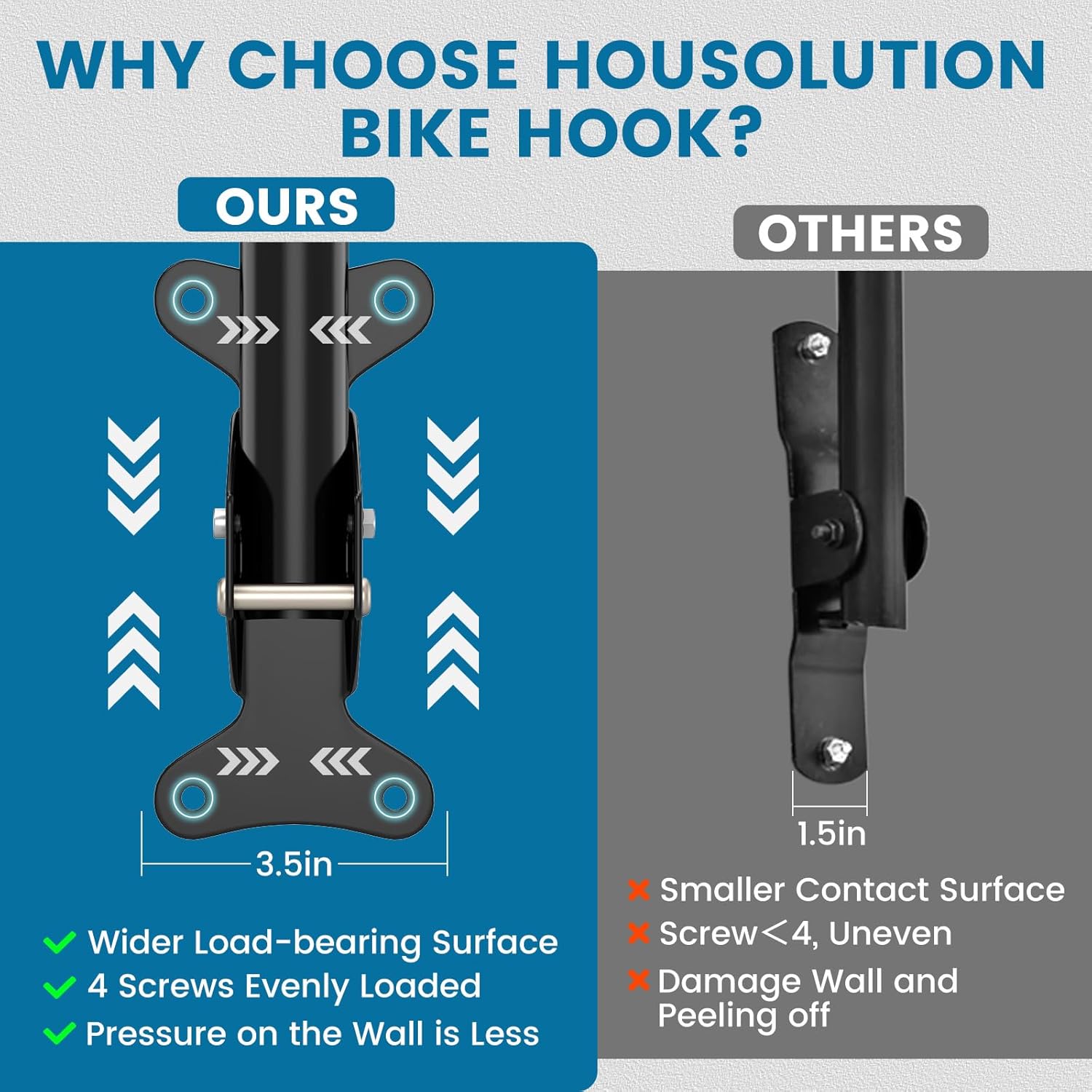 - Secure Storage, Save Space: Made of high-grade sturdy steel, the bicycle wall hanger keeps your bicycle safe. With the Max 90° adjustable angle, the rack can accommodate various frame shapes, keeping the bicycle level and fixed. Housolution bicycle wall mount is an ideal space saving option for apartments, houses, garages, and sheds by horizontally hanging the bicycle on the wall.