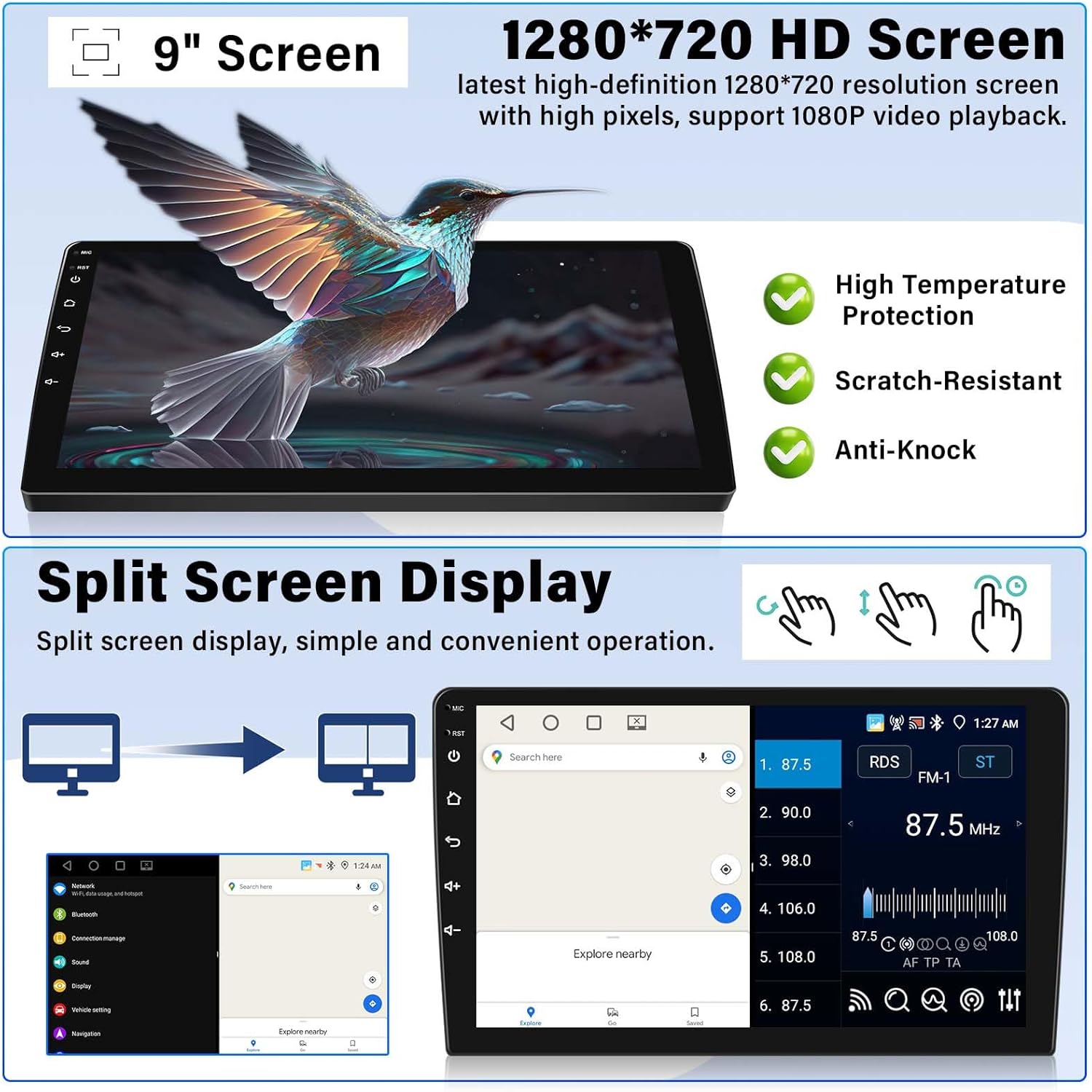 - Special Feature : Android 13, 4G+64G & 1280*720 HD Touch Screen and Split Screen, Backup Camera Input and Steering Wheel Control, Bluetooth 5.0 and FM/ RDS Radio, DSP Audio & EQ, WiFi & GPS/GLONASS/Beidou Navigation, Wireless Apple CarPlay and Android Auto, Mirror Link Android 13, 4G+64G & 1280*720 HD Touch Screen and Split Screen, Backup Camera Input and Steering Wheel Control, Bluetooth 5.0 and FM/ RDS Radio, DSP Audio & EQ, WiFi & GPS/GLONASS/Beidou Navigation, Wireless Apple C… See more