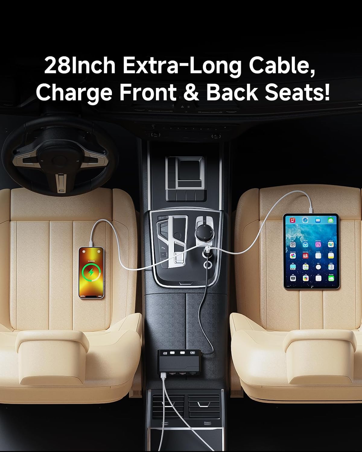 - 【28Inch Extra-Long Cable】Power Front & Back Seats! With a 28inch extended cable, this cigarette lighter splitter reaches rear passengers easily. Great for family trips and Uber/Lyft drivers—keep everyone’s devices charged