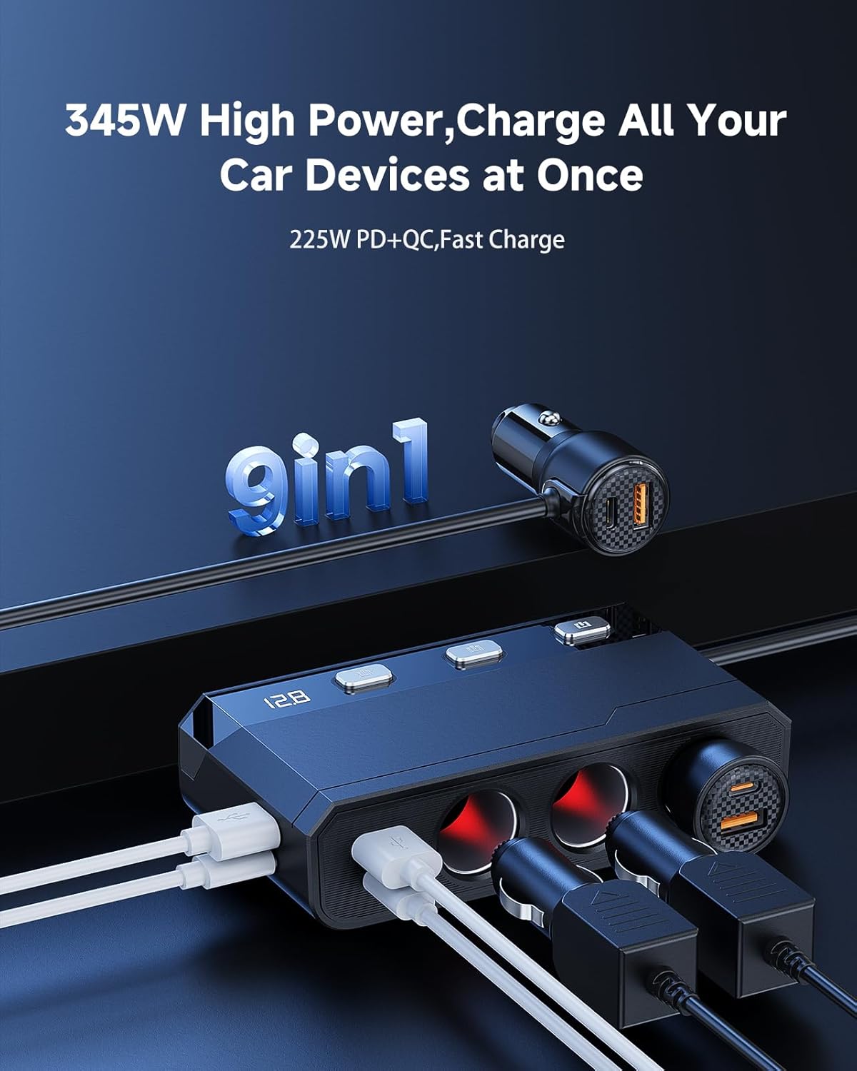 - 【345W High Power】Charge 6 Devices at Once! This cigarette lighter adapter delivers 345W massive power, with 225W fast charging (3×QC3.0 + 3×PD ports) and 120W cigarette lighter outputs, allowing you to simultaneously power phones, GPS, dash cams, car fridges, and more. Perfect for road trips and Uber drivers
