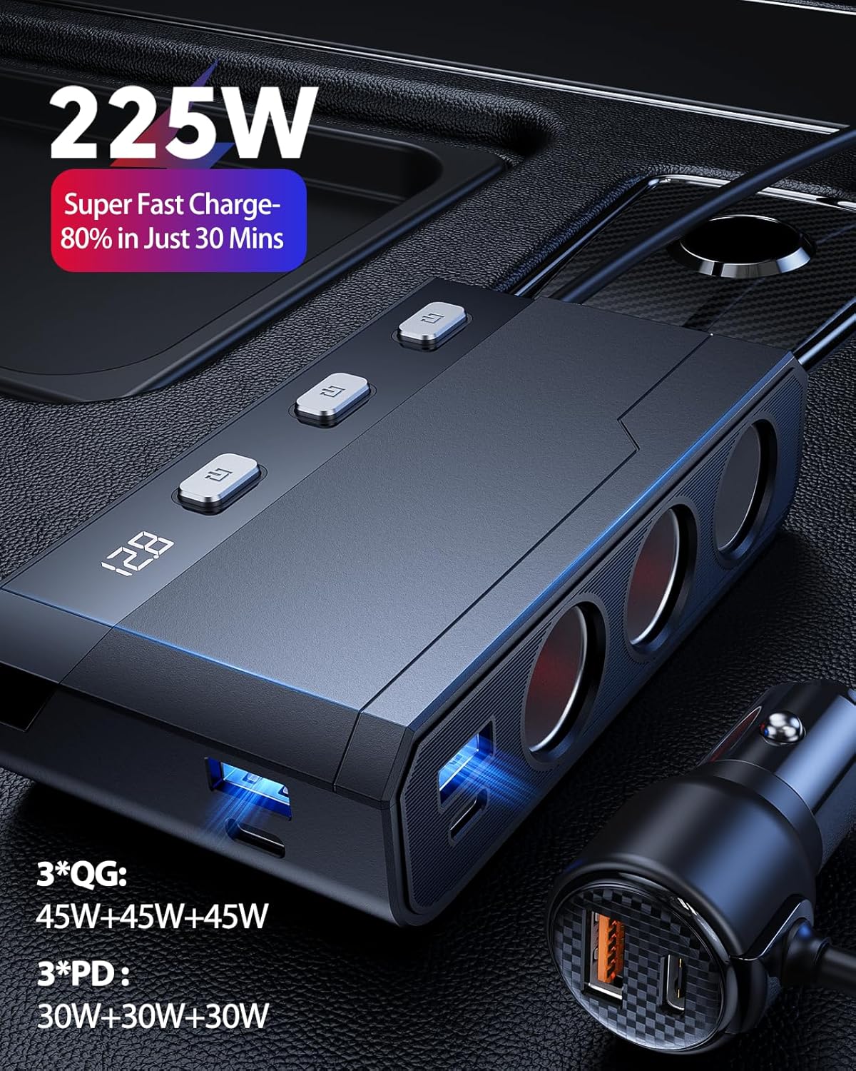 - 【225W Super Fast Charge】80% in 30 Minutes! Unlike slow car charger adapters, our cigarette lighter USB charger features 3×30W QC3.0 + 3×45W PD ports, charging 6 devices at lightning speed. Ideal for iPhones, iPads, and tablets—never run out of battery on the go