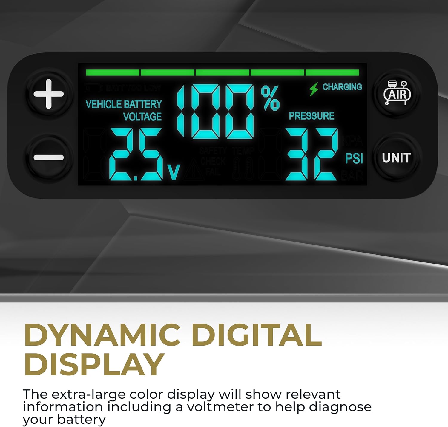 - DESIGN: 4-in-1 Design (Jump + Inflate + Charge + Illuminate), 1500 Peak Amps, Up to 80 Jumps on a Full Charge, 3-Step Jump Start, Spark-Proof Technology, Patented Safety Protection, Integrated Voltmeter, Dynamic Digital Display, Integrated Air Compressor, Precision Air Pressure Control, Bi-Directional USB-C, Pass-through Charging, 3-Way Multi-device Charging, 3-Mode Floodlight (White, Red & Red SOS), Durable Construction. Air Travel Ready